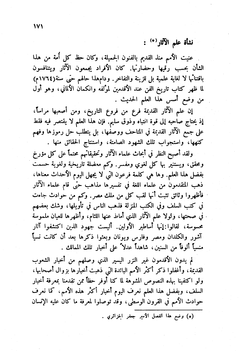 إن علم الآثار القديمة فرع من فروع التاريخ، ومن أصعبها مراساً، إذ يحتاج صاحبه إلى قوة انتباه وذوق سليم. فإن هذا العلم لا يقتصر فيه فقط على جمع الآثار القديمة في المتاحف ووصفها، بل يتطلب حل رموزها وفهم كنهها، واستجواب تلك الشهود الصامتة، واستنتاج الحقائق منها.