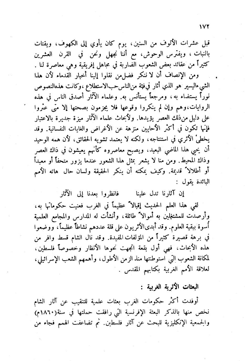 ومن الإنصاف أن لا ننكر فضل من نقلوا إلينا أخبار القدماء لأن هذا الشيء اليسير هو الذي أثار في فئة من الناس حب الاستطلاع، وكانت هذه النصوص نوراً يستضاء به، ومراجعاً يستأنس به. وعلماء الآثار أصدق الناس في هذه الروايات، وهم وإن لم ينكروا وقوعها فلا يجزمون بصحتها إلا متى عثروا على دليل من ذلك العصر يؤيدها. ولأبحاث علماء الآثار ميزة جديرة بالاعتبار فإنها تكون في أكثر الأحايين منزهة عن الأغراض والغايات النفسانية. وقد يخطئ الأثري في استنتاجة، ولكنه لا يعتمد تشويه الحقائق، لأن همه الوحيد أن يحيي هذا الماضي البعيد، ويصبح ومعاصروه كأنهم يعيشون في ذاك العصر وذاك المحيط. ومن منا لا يشعر بمثل هذا الشعور عندما يزور متحفاً أو معبداً أو أطلالاً قديمة. وكيف يمكنه أن ينكر الحقيقة ولسان حال هاته الأمم البائدة يقول: