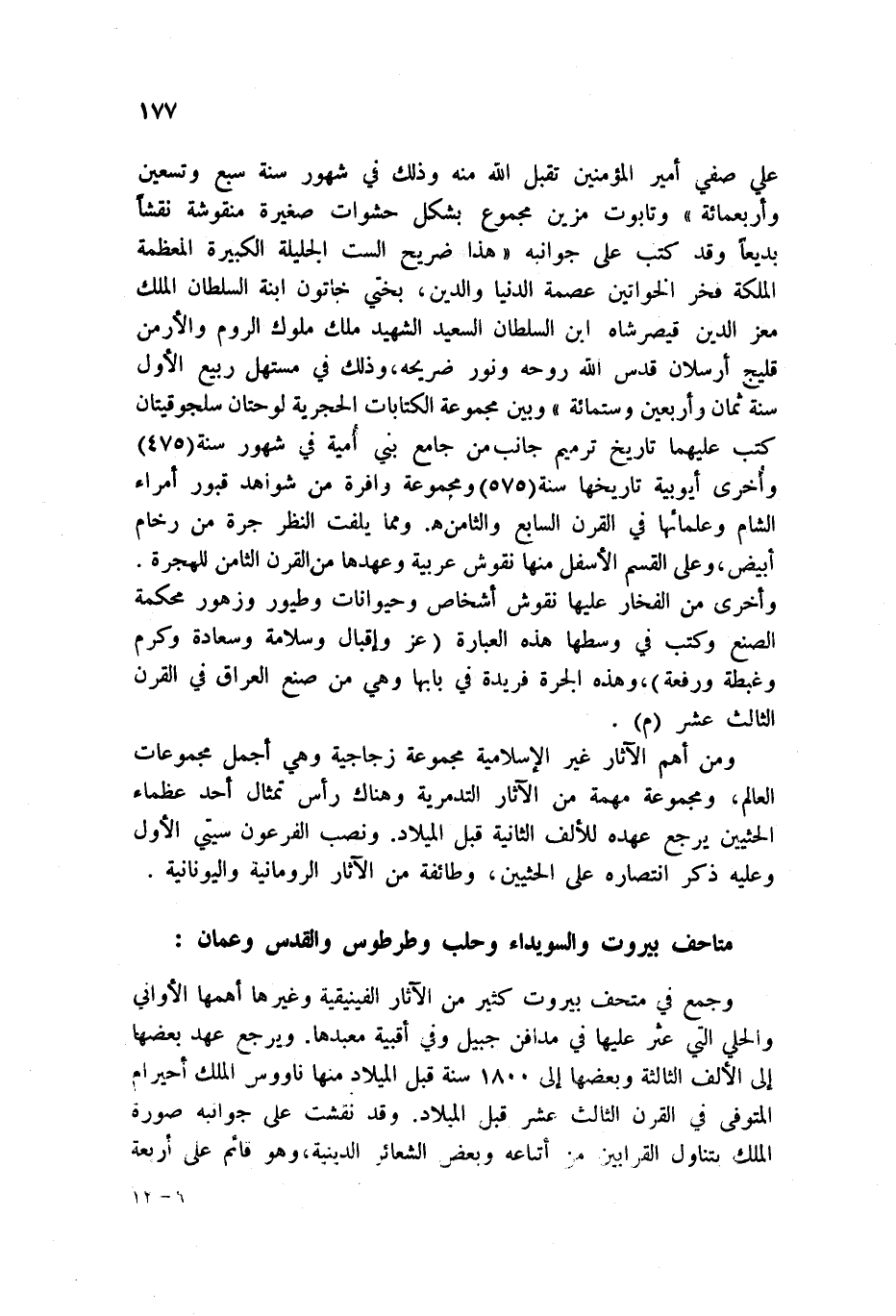 علي صفي أمير المؤمنين تقبل الله منه وذلك في شهور سنة سبع وتسعين وأربعمائة وتابوت مزين مجموع يشكل حشوات صغيرة منقوشة نقشاً بديعاً وقد كتب على كل جوانبههذا ضريح الست الجليلة الكبيرة المعظمة الملكة فخر الخواتين عصمة الدنيا والدين، بختي خاتون ابنة السلطان الملك معز الدين قيصر شاه ابن السلطان السعيد الشهيد ملك ملوك الروم والأرمن قليج أرسلان قدس الله روحه ونور ضريحه، وذلك في مستهل ربيع الأول سنة ثمان وأربعين وستمائة وبين مجموع الكتابات الحجرية لوحتان سلجوقيتان كتب عليهما تاريخ ترميم جانب من جامع بني أمية في شهور سنة 475 وأخرى أيوبية تاريخها سنة 575 ومجموعة وافرة من شواهد قبور أمراء الشام وعلمائها في القرن السابع والثامن هـ. ومما يلفت النظر جرة من رخام أبيض، وعلى القسم الأسفل منها نقوش عربية وعهدها من القرن الثامن للهجرة. وأخرى من الفخار عليها نقوش أشخاص وحيوانات وطيور وزهور محكمة الصنع وكتب في وسطها هذه العبارة عز وإقبال وسلامة وسعادة وكرم وغبطة ورفعة، وهذه الجرة فريدة في بابها وهي من صنع العراق في القرن الثالث عشر م.