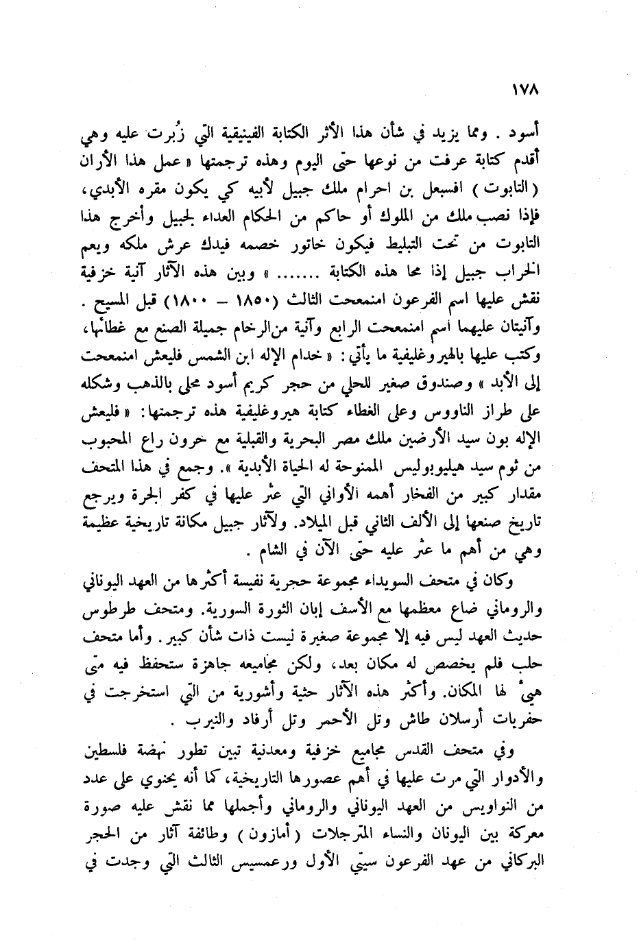 أسود. ومما يزيد في شأن هذا الأثر الكتابة الفينيقية التي زبرت عليه وهي أقدم كتابة عرفت من نوعها حتى اليوم وهذه ترجمتهاعمل هذا الأران التابوت أفسبعل بن احرام ملك جبيل لأبيه كي يكون مقره الأبدي، فإذا نصب ملك من الملوك أو حاكم من الحكام العداء لجبيل وإخراج هذا التابوت من تحت التبليط فيكون خاتون خصمه فيدك عرش ملكه ويعم الخراب جبيل إذا محا هذه الكتابة. . . . . . وبين هذه الآثار آنية خرافية تقش عليها اسم الفرعون امنمعحت الثالث 1850 - 1800 قبل المسيح. وآنيتان عليهما اسم امنمعحت الرابع وآنية من الرخام جميلة الصنع مع غطائها، وكتب عليها بالهيروغليفية ما يأتي: خدام الإله ابن الشمس فليعش امنمعحت إلى الأبد وصندوق صغير للحلي من حجر كريم أسود محلى بالذهب وشكله على طراز الناووس وعلى الغطاء كتابه هيروغليفية هذه ترجمتها: فليعش الإله بون سيد الأرضين ملك مصر البحرية والقبلية مع خرون راع المحبوب راع المحبوب من ثوم سيد هيليوبوليس الممنوحة له الحياة الأبدية. وجمع في هذا المتحف مقدار كبير من الفخار أهمه الأواني التي عثر عليها في كفر الجرة ويرجع تاريخ صنعها إلى الألف الثاني قبل الميلاد. ولآثار جبيل مكانة تاريخية عظيمة وهي من أهم ما عثر عليه حتى الآن في الشام.