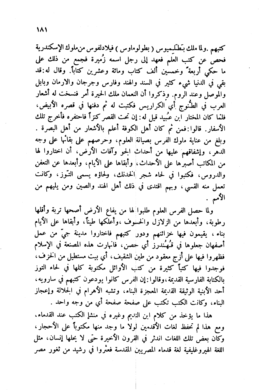 ولما حصل الفرس العلوم طلبوا لها من يفاع الأرض أصحها تربة وأقلها رطوبة، وأبعدها من الزلازل والخسوف، وأعلكها طيناً، وأبقاها على الأيام بناء، يقيمون فيها خزائنهم ودور كتبهم فاختاروا مدينة جي من عمل أصفهان جعلوها في قنهندرز أي حصن، فانهارت هذه المصنعة في الإسلام فظهروا فيها أزج معقود من طين الشقيف، أي بيت مستطيل من الخرف، فوجدوا فيها كتباً كثيرة من كتب الأوائل مكتوبة كلها في لحاء التوز بالكتابة الفارسية القديمة، وقالوا: إن الفرس كانوا يودعون كتبهم في سارويه، أحد الأبنية الوثيقة القديمة المعجزة النباء، وتشبه الأهرام في الجللة وإعجاز البناء، وكانت الكتب على صفحة صفحة أي من وجه واحد.