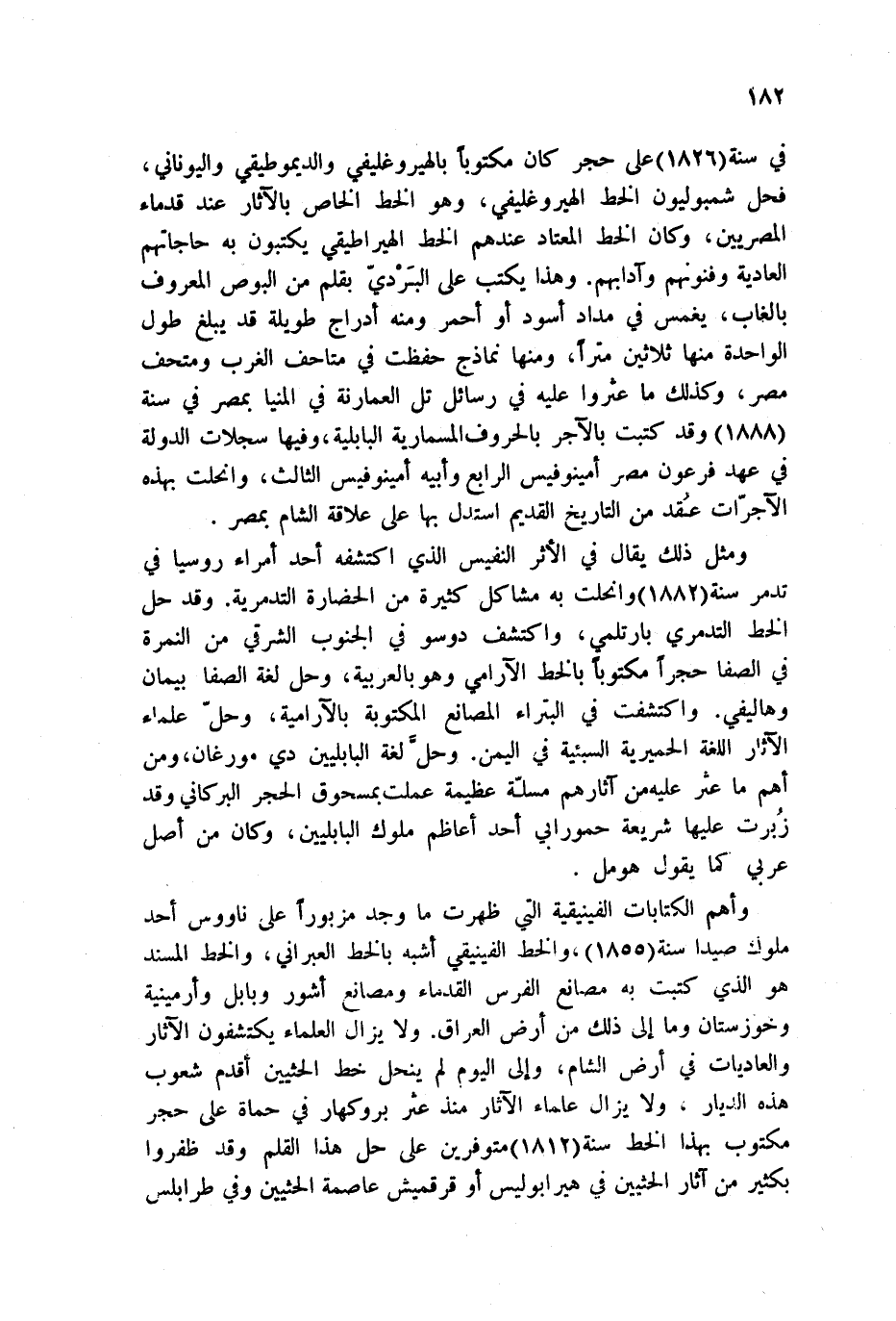 في سنة 1826 على حجر كان مكتوباً بالهيروغليفي، وهو الخط الخاص بالآثار عند قدماء المصريين، وكان الخط المعتاد عندهم الخط الهيراطيقي يكتبون به حاجاتهم العادية وفنونهم وآدابهم. وهذا يكتب على البردي بقلم من البوص المعروف بالغاب، يغمس في مدار أسود أو أحمر ومنه أدراج طويلة قد يبلغ طول الواحدة منها ثلاثين متراً، ومنها نماذج حفظت في متاحف الغرب ومتحف مصر، وكذلك ما عثروا عليه في رسائل تل العمارنة في المنيا بمصر في سنة 1888 وقد كتبت بالآجر بالحروف المسمارية البابلية، وفيها سجلات الدولة في عهد فرعون مصر أمينوفيس الرابع أمينوفيس الثالث، وانحلت بهذه الآجرات عقد من التاريخ القديم استدل بها على علاقة الشام بمصر.