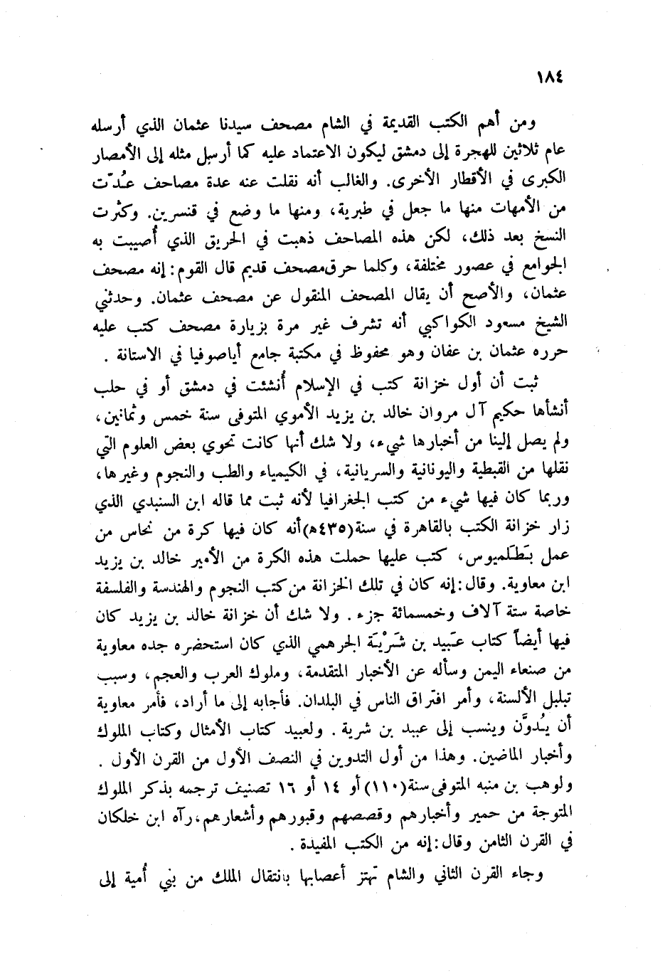 ومن أهم الكتب القديمة في الشام مصحف سيدنا عثمان الذي عام ثلاثين للهجرة إلى دمشق ليكون الاعتماد عليه كما أرسل مثله إلى الأمصار الكبرى في الأقطار الأخرى. والغالب أنه نقلت عنه عدة مصاحف عدت من الأمهات منها ما جعل في طبرية، ومنها ما وضع في قنسرين. وكثرت النسخ بعد ذلك، لكن هذه المصاحف ذهبت في الحريق الذي أصيبت به الجوامع في عصور مختلفة، وكلما حرق مصحف قديم قال القوم: إنه مصحف عثمان، والأصح أن يقال المصحف المنقول عن مصحف عثمان. وحدثين الشيخ مسعود الكواكبي أنه تشرف غير مرة بزيارة مصحف كتب عليه حرره عثمان بن عفان وهو محفوظ في مكتبة جامع أياصوفيا في الآستانة.