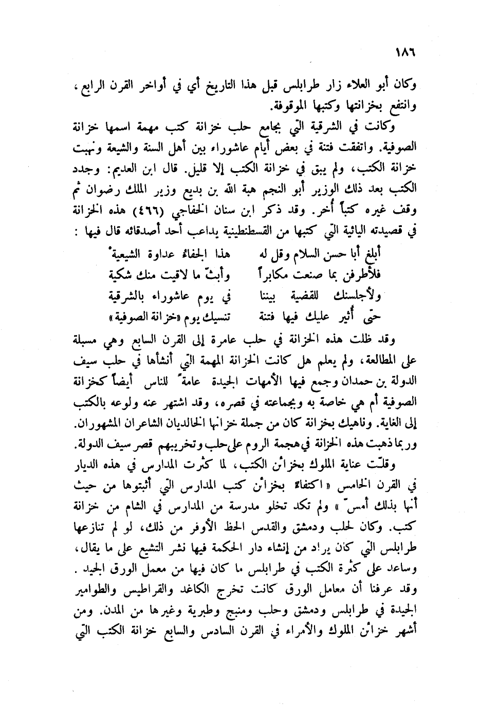 وقد ظلت هذه الخزانة في حلب عامرة إلى القرن السابع وهي مسبلة على المطالعة، ولم يعلم هل كانت الخزانة المهمة التي أنشأها في حلب سيف الدولة بن حمدان وجمع فيها الأمهات الجيدة عامة للناس أيضا كخزانة الصوفية أم هي خاصة به وبجماعته في قصره، وقد أشتهر عنه ولوعه بالكتب إلى الغاية. وناهيك بخزانة كان من جملة خزانها الخالديان الشاعران المشهوران. وربما ذهبت هذه الخزانة في هجمة الروم على حلب وتخريبهم قصر سيف الدولة. وقلت عناية الملوك بخزائن الكتب، لما كثرت المدارس في هذه الديار في القرن الخامس اكتفاء بخزائن كتب المدارس التي أثبتوها من حيث أنها بذلك أمس ولو تكد تخلو مدرسة من المدارس في الشام من خزانة كتب. وكان لحلب ودمشق والقدس الحظ الأوفر من ذلك، لو لم تنازعها طرابلس التي كان يراد من إنشاء دار الحكمة فيها نشر التشيع على ما يقال، وساعد عل كثرة الكتب في طرابلس ما كان فيها من معمل الورق الجيد. وقد عرفنا أن معامل الورق كانت تخرج الكاغد والقراطيس والطوامير الجيدة في طرابلس ودمشق وحلب ومنبج وطبرية وغيرها من المدن. ومن أشهر خزائن الملوك والأمراء في القرن السادس والسابع خزانة الكتب التي
