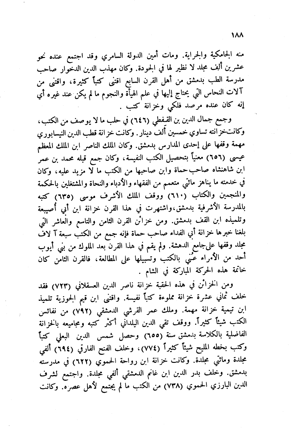 وجمع جمال الدين بن القفطي 646 في حلب ما لا يوصف من الكتب، وكانت خزانته تساوي خمسين ألف دينار. وكانت خزانة قطب الدين النيسابوري مهمة وقفها على إحدى المدارس بدمشق. وكان الملك الناصر ابن الملك المعظم عيسى 656 معيناً بتحصيل الكتب النفيسة، وكان جمع محمد بن عمر ابن شاهنشاه صاحب حماة وابن صاحبها من الكتب ما لا مزيد عليه، وكان في خدمته ما يناهز مائتي متعمم من الفقهاء والأدباء والنحاة والمشتغلين بالحكمة والمنجمين والكتاب 610 ووقف الملك الأشرف موسى 635 كتبه بالمدرسة الأشرفية بدمشق، واشتهرت في هذا القرن خزانة ابن أبي أُصيبعة وتلمذه ابن القف بدمشق. ومن خزائن القرن الثامن والتاسع والعاشر التي بلغنا خبرها خزانة أبي الفداء صاحب حماة فإنه جمع من الكتب سبعة آلاف مجلد وقفها على جامع الدهشة. ولم يقم في هذا القرن بعد الملوك من بني أيوب أحد من الأمراء عُني بالكتب وتسبيلها على المطالعة، فالقرن الثامن كان خاتمة هذه الحركة المباركة في الشام.