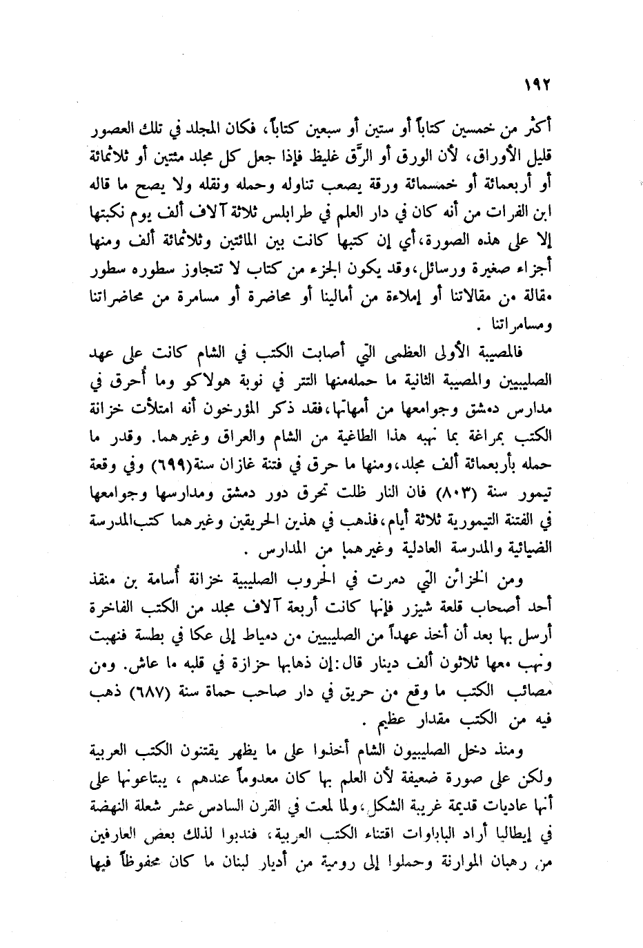 أكثر من خمسين كتاباً أو ستين أو سبعين كتاباً، فكان المجلد في تلك العصور قليل الأوراق، لأن الورق أو الرق غليظ فإذا جعل كل مجلد مئتين أو ثلاثمائة أو أربعمائة أو خمسمائة ورقة يصعب تناوله وحمله ونقله ولا يصح ما قاله ابن الفرات من انه كان في دار العلم في طرابلس ثلاثة آلاف ألف يوم نكبتها إلا على هذه الصورة، أي إن كتبها كانت بين المائتين وثلاثمائة ألف ومنها أجزاء صغيرة ورسائل، وقد يكون الجزء من كتاب لا تتجاوز سطوره سطور مقالة من مقالاتنا أو إملاءة من أمالينا أو محاضرة أو مسامرة من محاضراتنا ومسامرتنا.