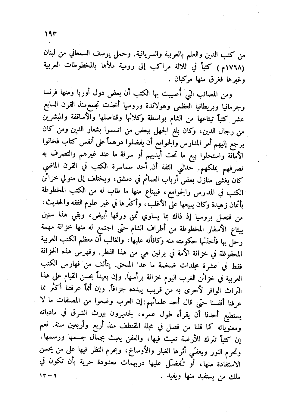 وإن بعيداً يحسن القيام على هذا التراث الوافر لأحرى به من قريب يبدده جزافاً. وإن أمماً عرفتنا أكثر مما عرفنا أنفسنا حتى قال أحد علمائهم: إن العرب وضعوا من المصنفات ما لا يستطيع أحدنا أن يقرأه طول عمره، لجديرون بإرث الشرق في مادياته ومعنوياته كما قلنا في فصل في مجلة المقتطف منذ أربع وأربعين سنة. نعم أن كتباً تترك للأرضة تعيث فيها، والعفن يعبث بجمال جسمها ورسمها، وتحرم النور ويعفى أثرها الغبار والأوساخ، ويحرم النظر فيها على من يحسن الاستفادة منها، أو تفضل عليها دريهمات معدودة حرية بأن تكون في ملك من يستفيد منها ويفيد.