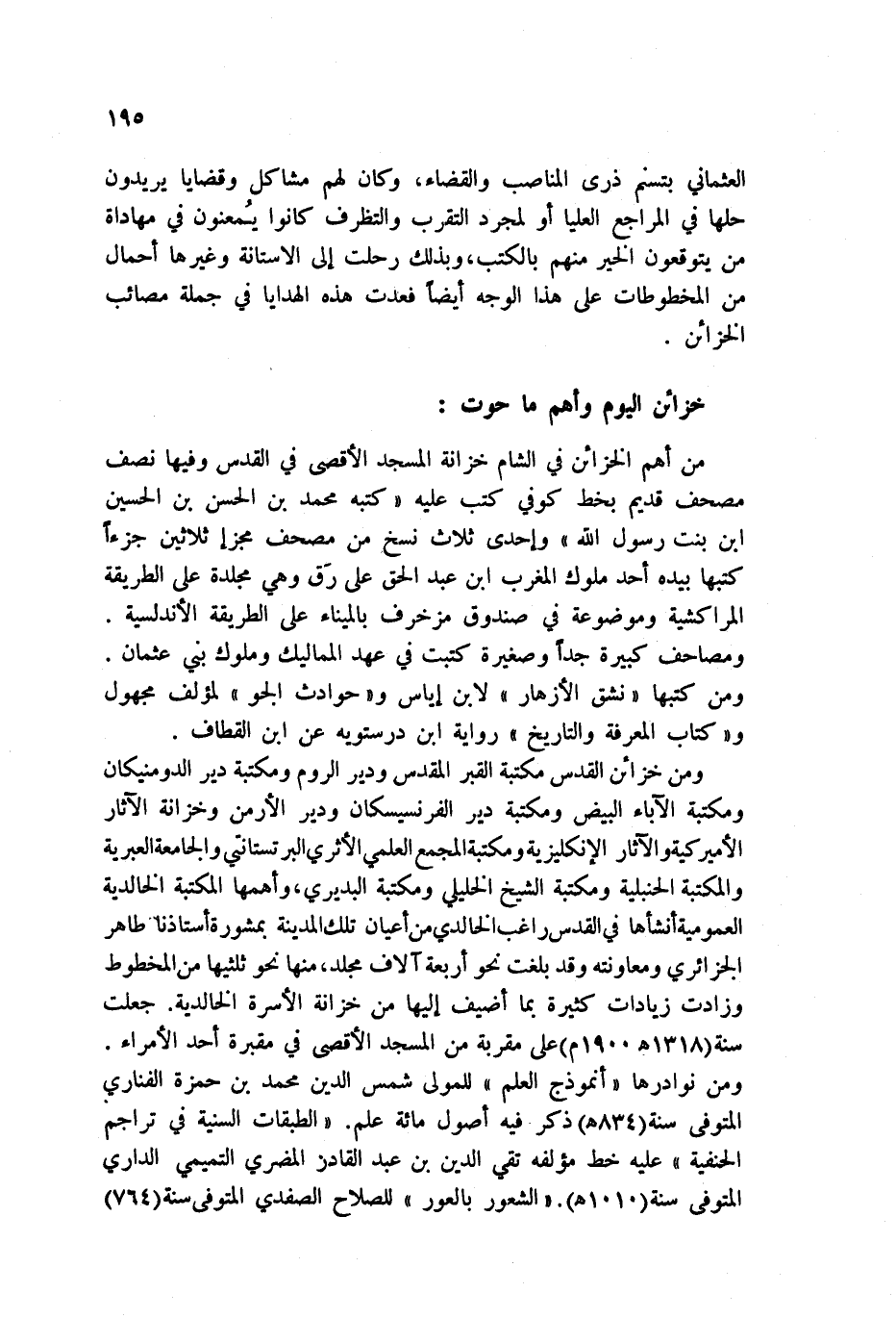 العثماني بتسم ذرى المناصب والقضاء، وكان لهم مشاكل وقضايا يريدون حلها في المراجع العليا أو لمجرد التقرب والتظرف كانوا يمعنون في مهاداة من يتوقعون الخير منهم بالكتب، وبذلك رحلت إلى الآستانة وغيرها أحمال من المخطوطات على هذا الوجه أيضاً فعدت هذه الهدايا في جملة مصائب الخزائن.