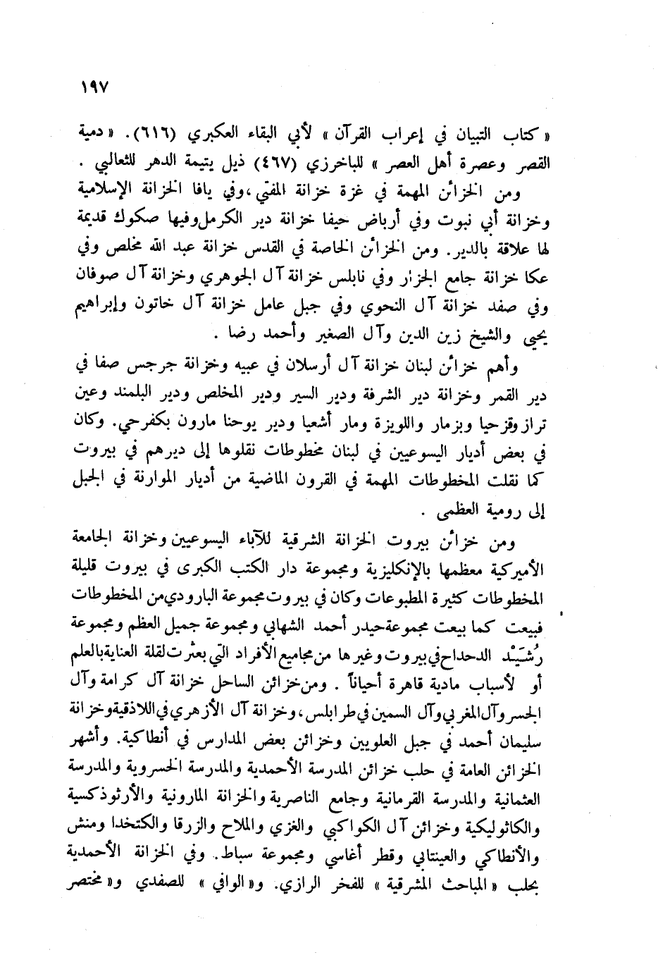 ومن خزائن بيروت الخزانة الشرقية للآباء وخزانة الجامعة الأمريكية معظمها بالإنكليزية ومجموعة دار الكتب الكبرى في بيروت قليلة المخطوطات كثيرة المطبوعات وكان في بيروت مجموعة البارودي من المخطوطات فبيعت كما بيعت محموعة حيدر أحمد الشهابي ومجموعة جميل العظيم ومجموعة رُشَيْد الدحداح في بيروت وغيرها من مجاميع الأفراد التي بعثرت لقلة العناية بالعلم أو لأسباب مادية قاهرة أحياناً. ومن خزائن الساحل خزانة آل كرامة وآل الجسر وأل المغربي وآل السمين في طرابلس، وخزانة آل الأزهري في اللاذقية وخزانة سليمان أحمد في جبل العلويين وخزائن بعض المدارس في إنطاكية. وأشهر الخزائن العامة في حلب خزائن المدرسة الأحمدية والمدرسة الخسروية والمدرسة العثمانية والمدرسة القرمانية وجامع الناصرية والخزانة المارونية والأرثوذكسية والكاثوليكية وخزائن آل الكواكبي والغزي والملامح والزرقا والكتخدا ومنش والأنطاكي والعينتابي وقطر أغاسي ومجموعة سباط. وفي الخزانة الأحمدية بحلب المباحث المشرقية للفخر الرازي. والوافي للصفدي ومختصر