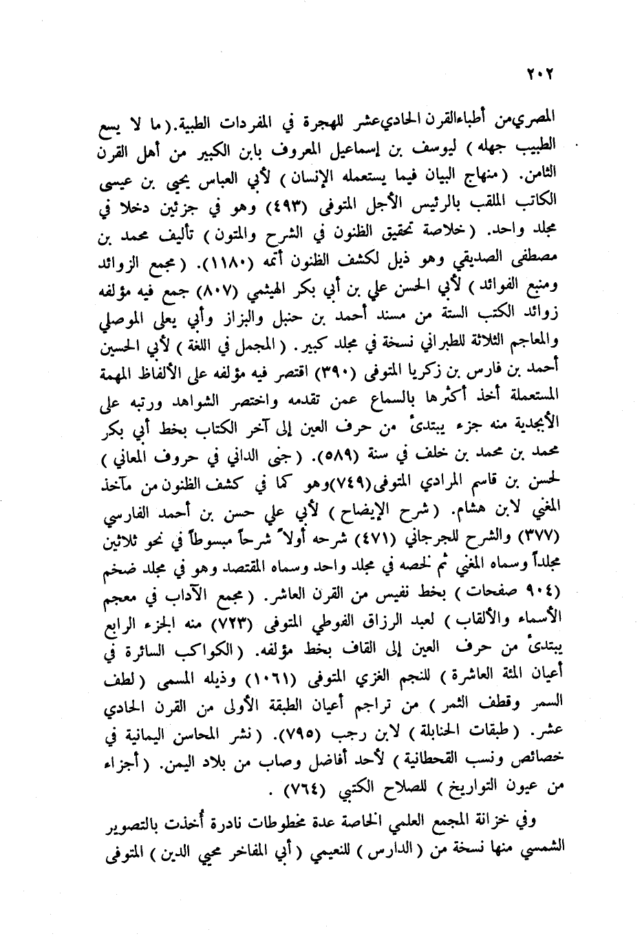 المصري من أطباء القرن الحادي عشر للهجرة في المفردات الطبية. مالا يسع الطبيب جهله ليوسف بن إسماعيل المعروف بابن الكبير من أهل القرن الثامن. منهاج البيان فيما يستعمله الإنسان لأبى العباس يحيى بن عيسى الكاتب الملقب بالرئيس الأجل المتوفى 493 وهو في جزأين دخلا في مجلد واحد. خلاصة تحقيق الظنون في الشرح والمتون تأليف محمد بن مصطفى الصديقي وهو ذيل لكشف الظنون أتمه 1180. مجمع الزوائد ومنبع الفوائد لأبى الحسن علي بن أبى بكر الهيثمي 807 جمع فيه مولفه زوائد الكتب الستة من مسند احمد بن حمبل والبزاز وأبى يعلى الموصلي والمعاجم الثلاثة للطبراني نسخة في مجلد كبير. المجمل في اللغة لأبى الحسين احمد بن فارس بن زكريا المتوفى 390