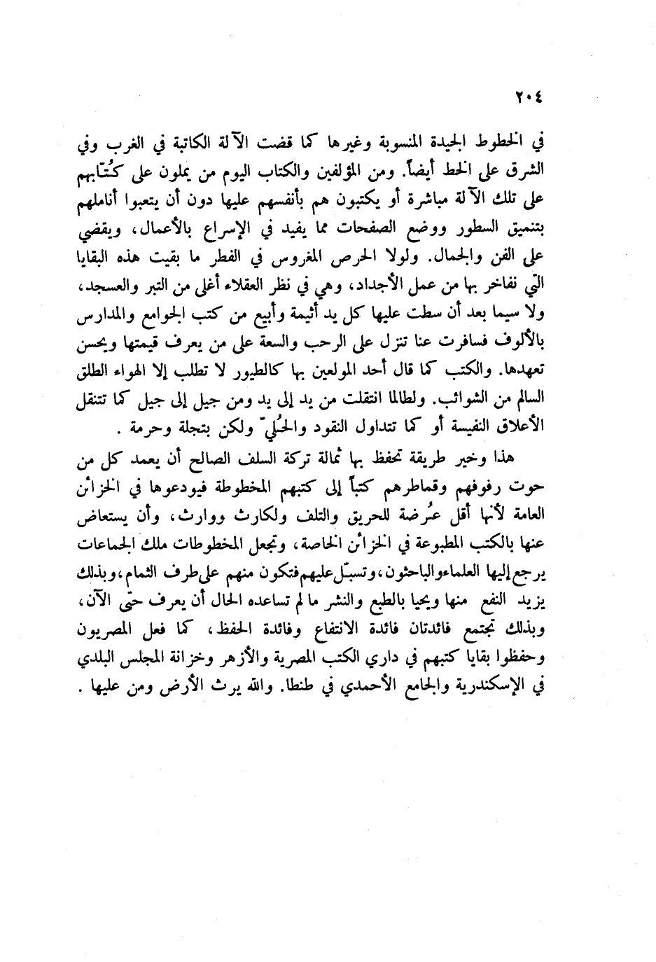 هذا وخير طريقة تحفظ بها ثمالة تركه السلف الصالح أن يعمد كل من حوت رفوفهم وطماطرهم كتباً إلى كتبهم المخطوطة فيودعوها في الخزائن العامة لأنها أقل عرضة للحريق والتلف ولكارث ووارث، وأن يستعاض عنها بالكتب المطبوعة في الخزائن الخاصة، وتجعل المخطوطات ملك الجماعات يرجع إليها العلماء والباحثون، وتسبل عليها فتكون منهم على طرف الثمار، وبذلك يزيد النفع منها ويحيا بالطبع والنشر ما لم تساعده الحال أن يعرف حتى الآن، وبذلك تجتمع فائدتان فائدة الانتفاع وفائدة الحفظ، كما فعل المصريون وحفظوا بقايا كتبهم في داري الكتب المصرية والأزهر وخزانة المجلس البلدي في الإسكندرية والجامع احمدي في طمطا والله يرث الأرض ومن عليها.