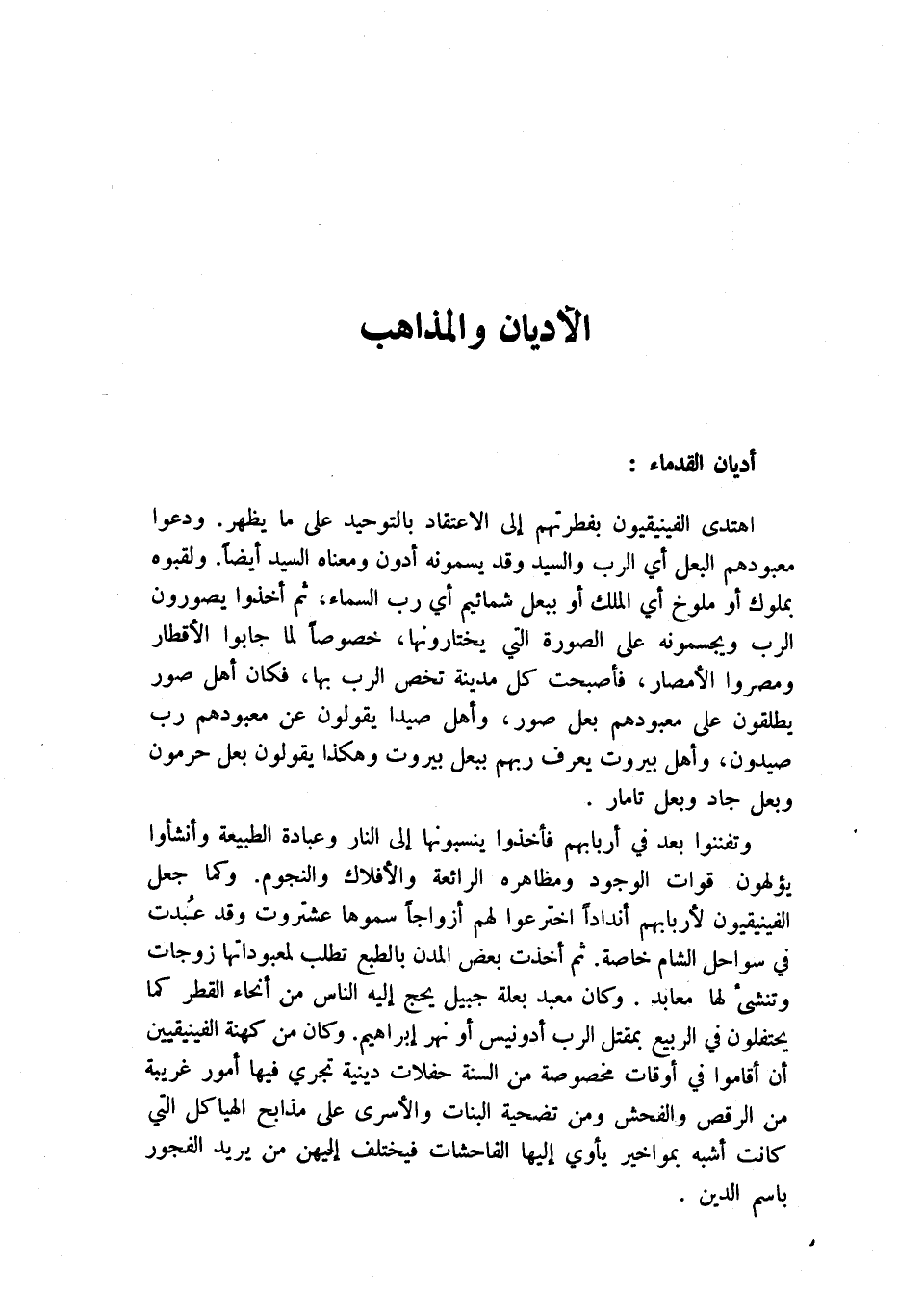 وفننوا بعد في أربابهم فأخذوا ينسبونها إلى النار وعبادة الطبيعة وأنشئوا يؤلهون قوات الوجود ومظاهرة الرائعة والأفلاك والنجوم. وكما جعل الفينيقيون لأربابهم أنداداً اخترعوا لهم أزواجاً سموها عشروت وقد عبدت في سواحل الشام خاصة. ثم أخذت بعض المدن بالطبع تطلب لمعبوداتها زوجات وتنشئ لها معابد. وكان معبد بعلة جبيل يحج إليه الناس من أنحاء القطر كما يحتفلون في الربيع بمقتل الرب أدونيس أو نهر إبراهيم. وكان من كهنة الفينيقيين أن أقاموا في أوقات مخصوصة من السنة حفلات دينية تجري فيها أمور غريبة من الرقص والفحش ومن تضحية البنات والأسرى على مذابح الهياكل التي كانت أشبه بمواخير يأوي إليها الفاحشات فيختلف إليهن من يريد الفجور باسم الدين.
