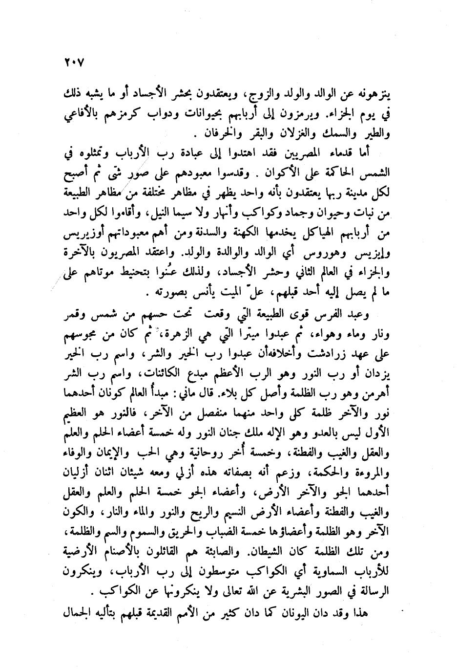 وعبد الفرس قوى الطبيعة التي وقعت تحت حسهم من شمس وقمر ونار وماء وهواء، ثم عبدوا ميترا التي هي الزهرة، ثم كان من مجوسهم على عهد زرادشت ولأخلافه أن عبدوا رب الخير والشر، واسم رب الخير يزدان أو رب النور وهو الرب الأعظم مبدع الكائنات، واسم رب الشر أهرمن وهو رب الظلمة وأصل كل بلاء. قال ماني: مبدأ العالم كونان أحدهما نور والأخر ظلمة كل واحد منهما منفصل من الآخر، فالنور هو العظيم الأول ليس بالعدو وهو الإله ملك جنان النور وله خمسة أعضاء الحلم والعلم والعقل والغيب والفطنة، وخمسة أخر روحانية وهي الحب والإيمان والوفاء والمروءة والحكمة، وزعم أنه بصفاته هذه أزلي ومعه شيئان اثنان أزليان أحدهما الجو والآخر الأرض، وأعضاء الجو خمسة الحلم والعلم والعقل والغيب والفطنة وأعضاء الأرض النسيم والريح والنور والماء والنار، والكون الآخر وهو الظلمة وأعضاؤها خمسة الضباب والحريق والسموم