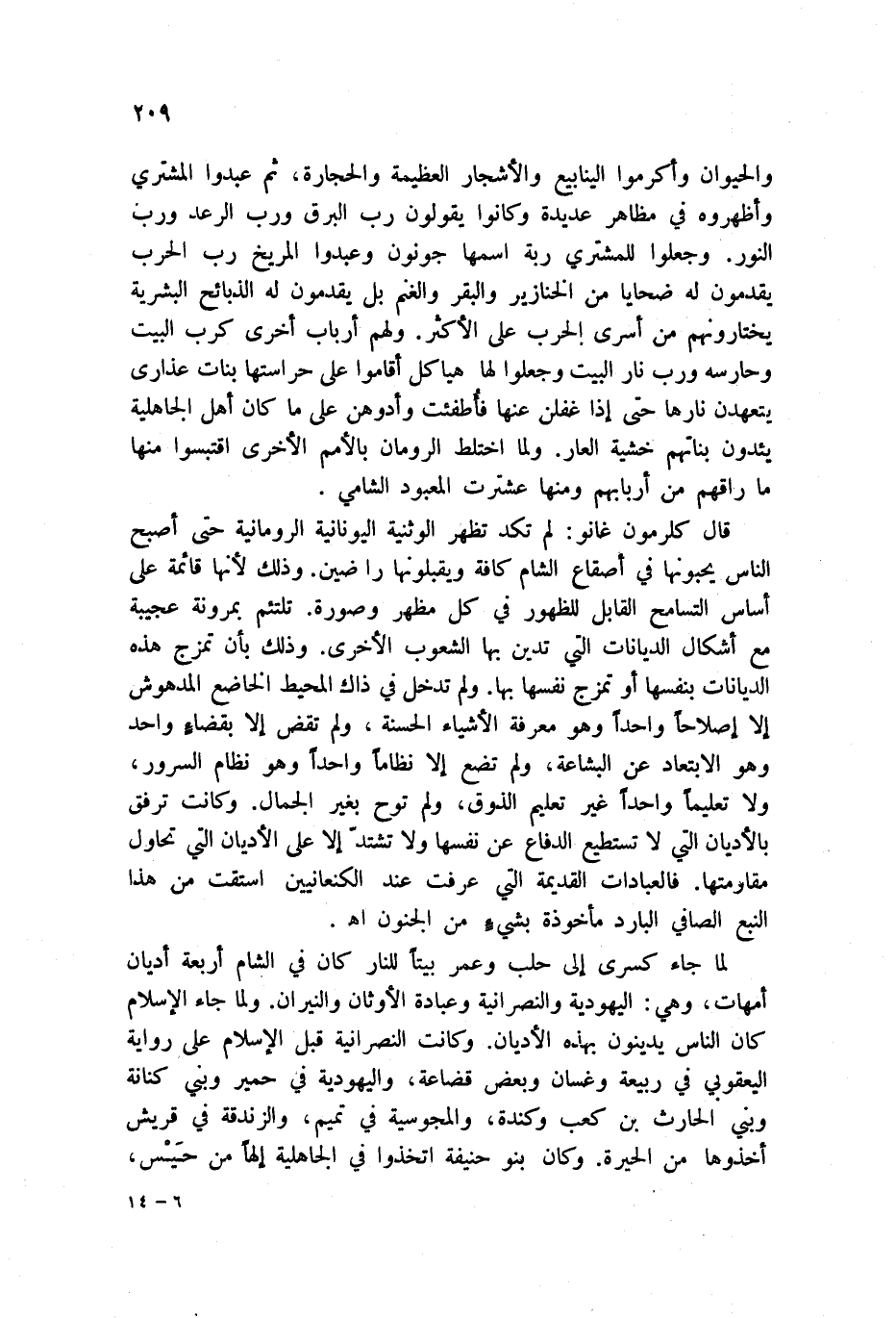 لما جاء كسرى إلى حلب وعمر بيتاً للنار كان في الشام أربعة أديان أمهات، وهي: اليهودية والنصرانية وعبادة الأوثان والنيران. ولما جاء الإسلام كان الناس يدينون بهذه الأديان. وكانت النصرانية قبل الإسلام على رواية اليعقوبة في ربيعو وغسان وبعض قضاعة، واليهودية في حمير وبني كنانة وبني الحارث بن كعب وكندة، والمجوسية في تميم، والزندقة في قريش أخذوها من الحيرة. وكان بنو حنيفة أخذوا في الجاهلية إلهاً من حيس،