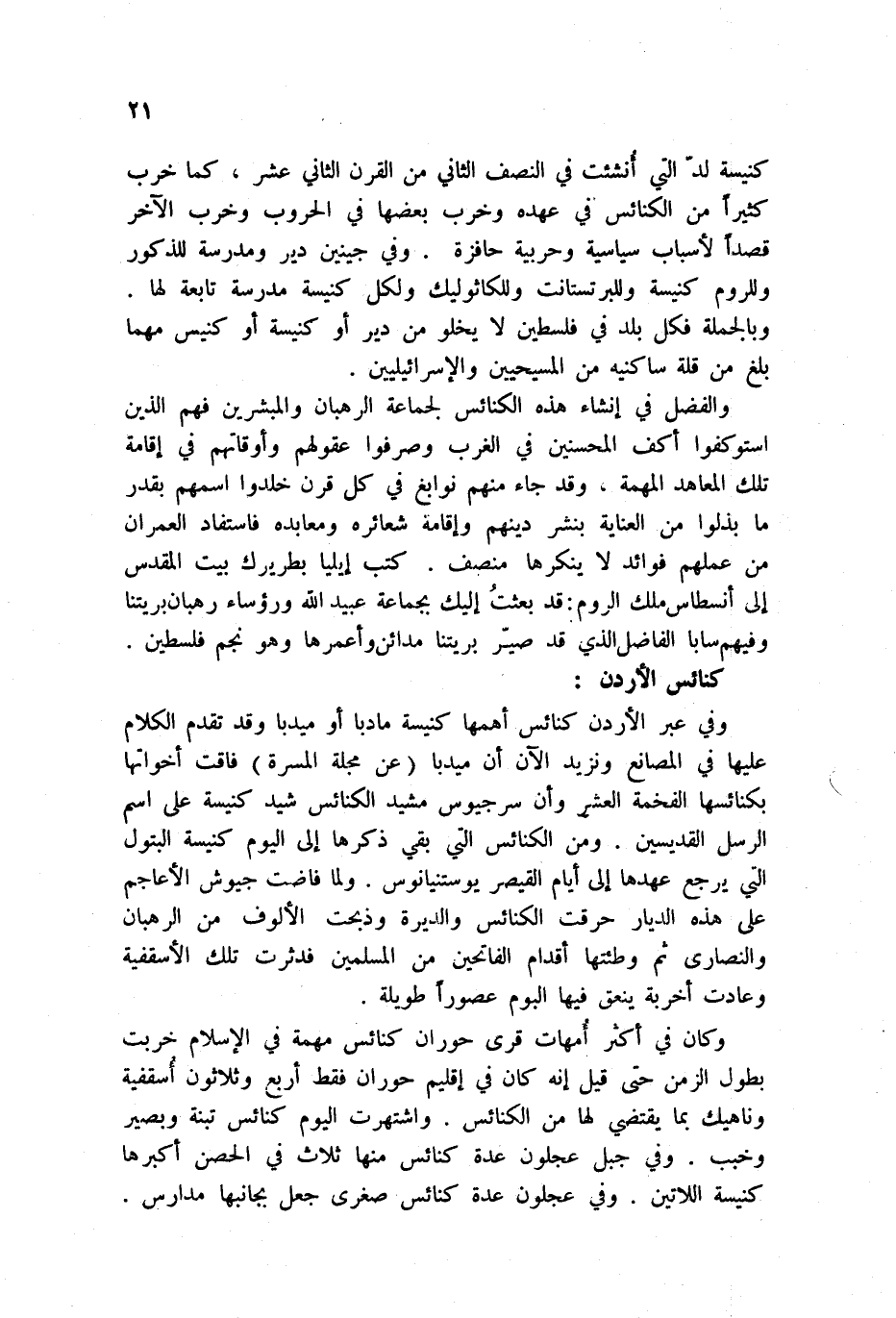 وكان في أكثر أمهات قرى حوران كنائس مهمة في الإسلام خربت بطول الزمن حتى قبل إنه كان في إقليم حوران فقط أربع وثلاثون أسقفية وناهيك بما يقتضي لها من الكنائس. واشتهرت اليوم كنائس تبنة وبصير وخبب. وفي جبل عجلون عدة كنائس منها ثلاث في الحصن أكبرها كنيسة اللاتين. وفي عجلون عدة كنائس صغرى جعل بجانبها مدارس.