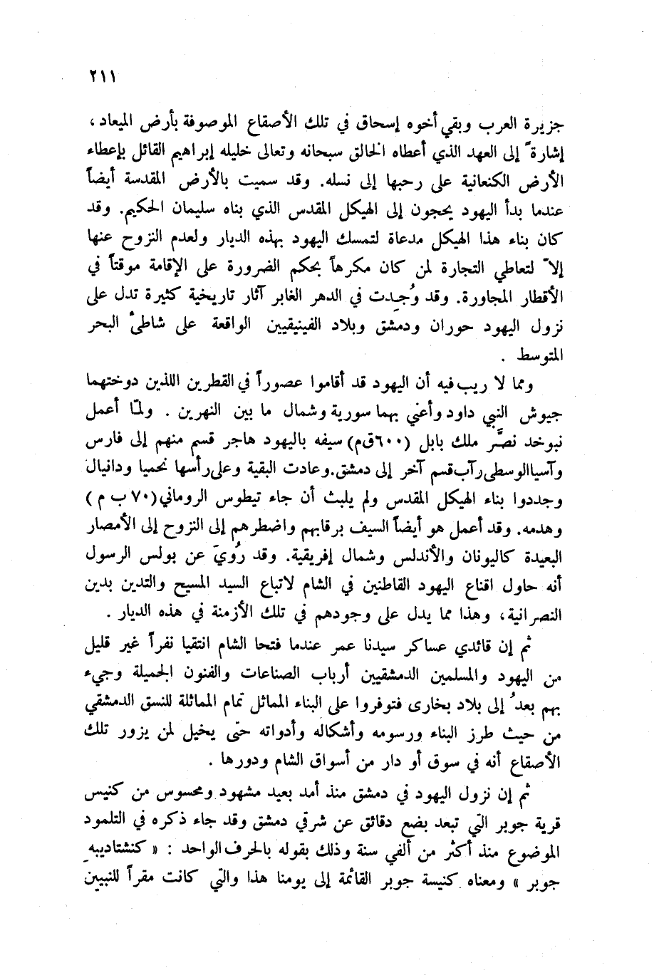 ثم إن نزول اليهود في دمشق منذ أمد بعيد مشهود ومحسوس من كنيس قرية جوبر التي تبعد بضع دقائق عن شرقي دمشق وقد جاء ذكره في التلمود الموضوع منذ أكثر من ألفي سنة وذلك بقوله في الحرف الواحد: كنشتاديبه جوبر ومعناه كنيسة جوبر القائمة إلى يومنا هذا والتي كانت مقراً للنبيين