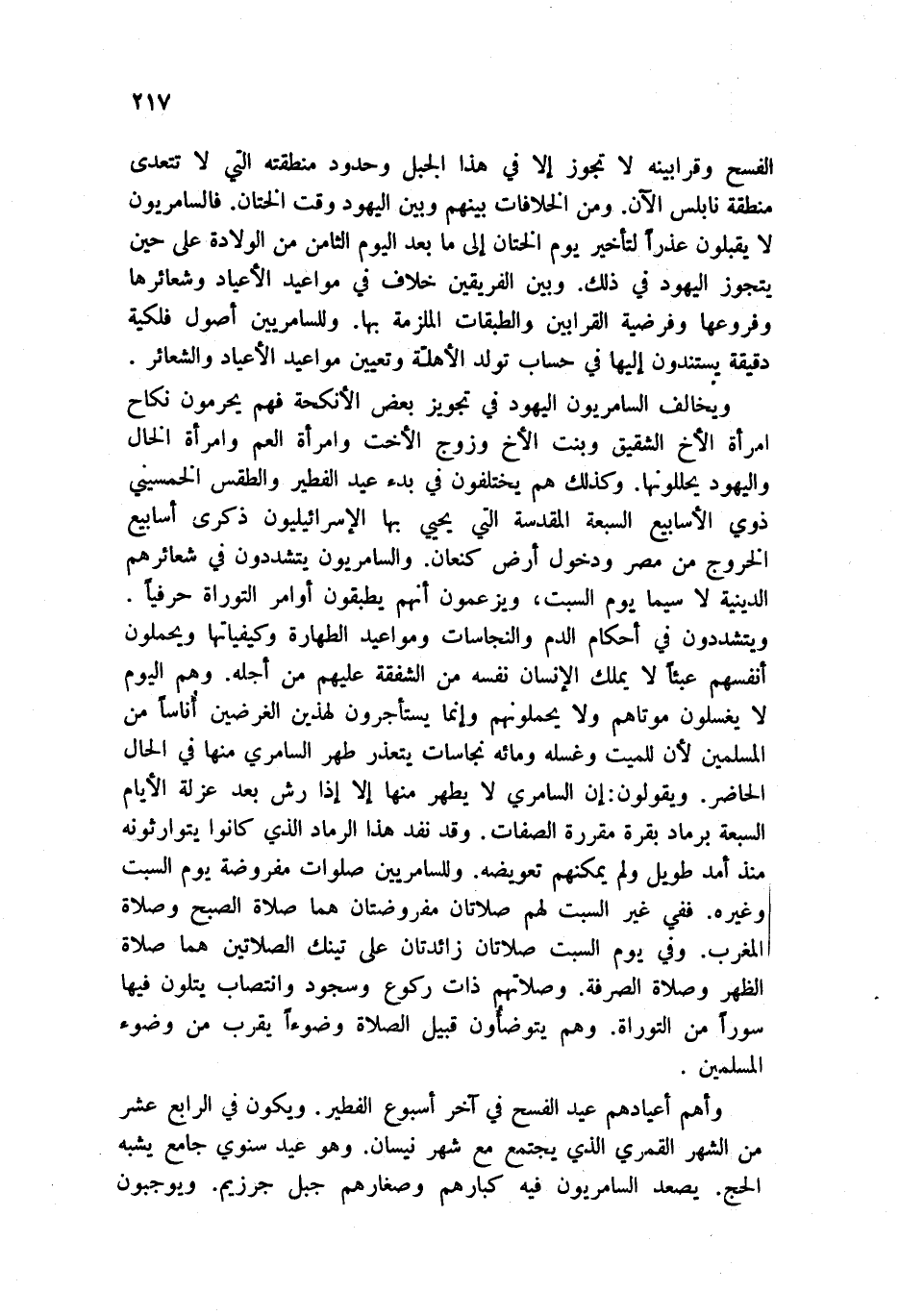 ويخالف السامريون اليهود في تجويز بعض الأنكحة فهم يحرمون نكاح امرأة الأخ الشقيق وبنت الأخ وزوج الأخت وامرأة العم وامرأة الخال واليهود يحللونها. وكذلك هم يختلفون في بدء عيد الفطير والطقس الخمسيني ذوي الأسابيع السبعة المقدسة التي يحيي بها الإسرائيليون ذكرى أسابيع الخروج من مصر ودخول أرض كنعان. والسامريون يتشددون في شعائرهم الدينية لا سيما يوم السبت، ويزعمون أنهم يطبقون أوامر التوراة حرفياً. ويتشددون في أحكام الدم والنجاسات ومواعيد الطهارة وكيفياتها ويحملون أنفسهم عبئاً لا يملك الإنسان نفسه من الشفقة عليهم من أجله. وهم اليوم لا يغسلون موتاهم ولا يحملونهم وإنما يستأجرون لهذين الغرضين أناسا من المسلمين لأن للميت وغسله ومائه نجاسات يتعذر طهر السامري منها في الحال الحاضر. ويقولون: إن السامري لا يطهر منها إلا إذا رش بعد عزلة الأيام السبعة برماد بقرة مقررة الصفات. وقد نفذ هذا الرماد الذي كانوا يتوارثونه منذ أمد طويل ولم يمكنهم تعويضه. وللسامريين صلوات مفروضة يوم السبت وغيره. ففي غير السبت لهم صلاتان مفروضتان هما صلاة الصبح وصلاة المغرب. وفي يوم السبت صلاتان زائدتان على تينك الصلاتين هما صلاة الظهر وصلاة الصرفة. وصلاتهم ذات ركوع وسجود وانتصاب يتلون فيها سوراً من التوراة. وهم يتوضئون قبيل الصلاة وضوءاً يقرب من وضوء المسلمين.