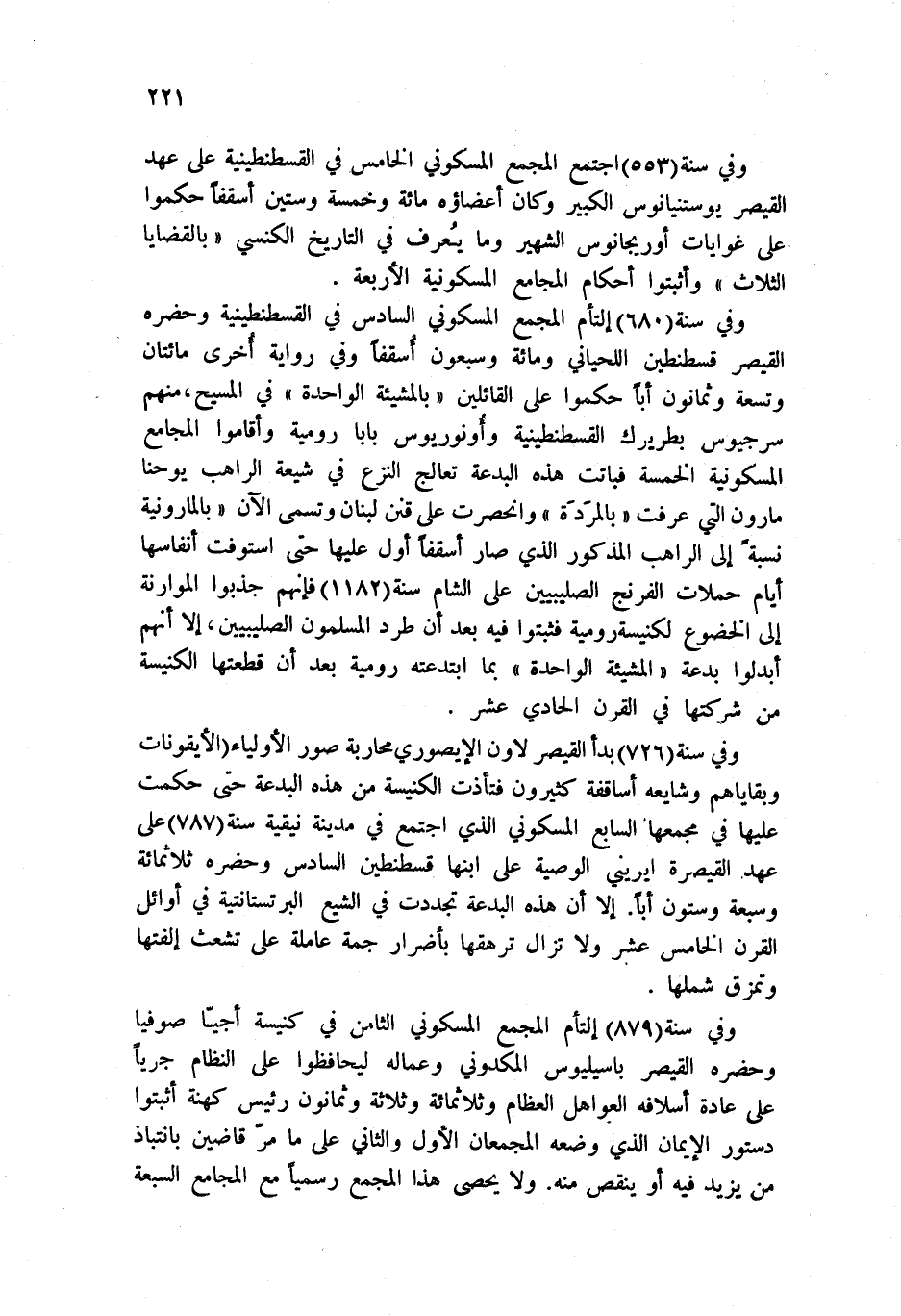 وفي سنة 680 التأم المجمع المسكوني السادس في القسطنطينية وحضرة القيصر قسطنطين اللحياني ومائة وسبعون أسقفاً وفي رواية أخرى مائتان وتسعة وثمانون أباً حكموا على القائلين بالمشيئة الواحدة في المسيح، منهم سرجيون بطريرك القسطنطينية وأونوريوس بابا رومية وأقاموا المجامع المسكونية الخمسة فباتت هذه البدعة تعالج النزع في شيعة الراهب يوحنا مارون التي عرفت بالمردة وانحصرت على فتن لبنان وتسمى الآن بالمارونية نسبة إلى الراهب المذكور الذي