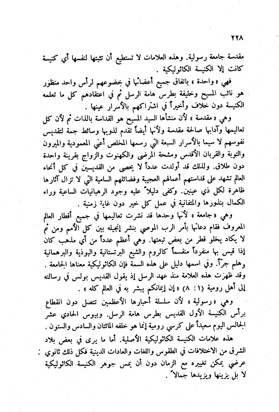 مقدسة جامعة رسولية. وهذه العلامات لا تستطيع أن تثبتها لنفسها أي كنيسة كانت إلا الكنيسة الكاثوليكية.