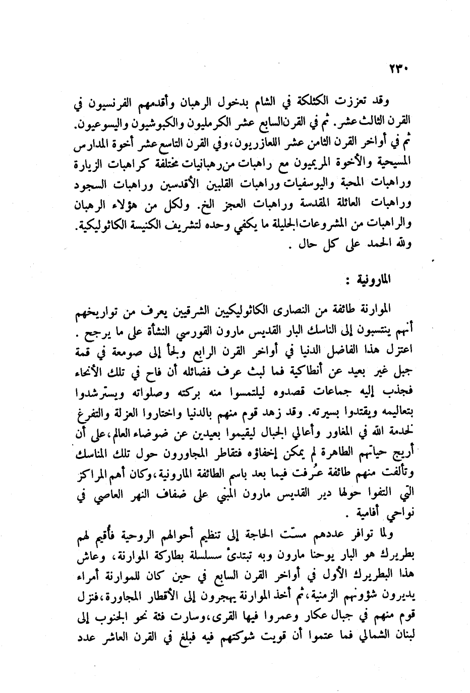 الموارنة طائفة من النصارى الكاثوليكيين الشرقيين بعرف من تواريخهم أنهم ينتسبون إلى الناسك البار القديس مارون القورسي النشأة على ما يرجع. اعتزل هذا الفاضل الدنيا في أواخر القرن الرابع ولجأ إلى صومعة في قمة جبل غير بعيد عن إنطاكية فما لبث عرف فضائله أن فاح في تلك الأنحاء فجذب إليه جماعات قصدوه ليلتمسوا منه بركته وصلواته ويسترشدوا بتعاليمه ويقتدوا بسيرته. وقد زهد قوم منهم بالدنيا واختاروا العزلة والتفرغ لخدمة الله في المغاور وأعالي الجبال ليقيموا بعيدين عن ضوضاء العالم، على أن أريج حياتهم الطاهرة لم يمكن إخفاؤه فتقاطر المجاورون حول تلك المناسك وتألفت منهم طائفة عرفت فيما بعد باسم الطائفة المارونية، وكان أهم المراكز التي التفوا حولها دير القديس مارون المبني على ضفاف النهر العاصي في نواحي أفامية.