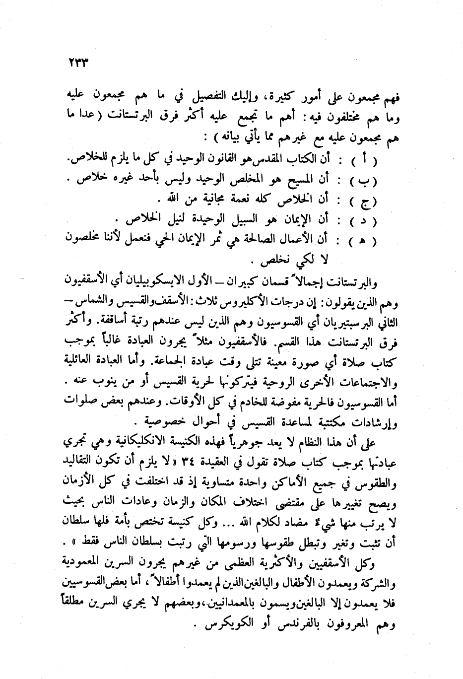 على أن هذا النظام لا يعد جوهرياً فهذه الكنيسة الأنكليكانية وهي تجري عبادتها بموجب كتاب صلاة تقول في العقيدة34 لا يلزم أن تكون التقاليد والطقوس في جميع الأماكن واحدة متساوية إذ قد اختلفت في كل الأزمان ويصح تغييرها على مقتضى اختلاف المكان والزمان وعادات الناس بحيث لا يرتب منها شيء مضاد لكلام الله. . . وكل كنيسة تختص بأمة فلها سلطان أن تثبت وتغير وتبطل طقوسها ورسومها التي رتبت بسلطان الناس فقط.