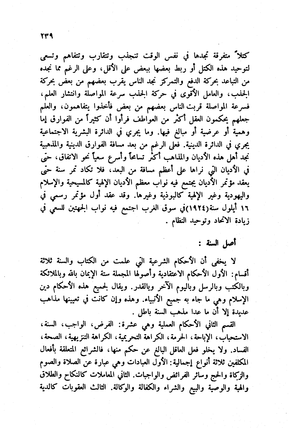 لا يخفى أن الأحكام الشرعية التي علمت من الكتاب والسنة ثلاثة أقسام: الأول الأحكام الاعتقادية وأصولها المجملة ستة الإيمان بالله وبالملائكة وبالكتب وبالرسل وباليوم الآخر وبالقدر. ويقال لجميع هذه الأحكام دين الإسلام وهي ما جاء به جميع الأنبياء. وهذه وإن كانت في تعيينها مذاهب عديدة إلا أن ما عدا مذهب السنة باطل.