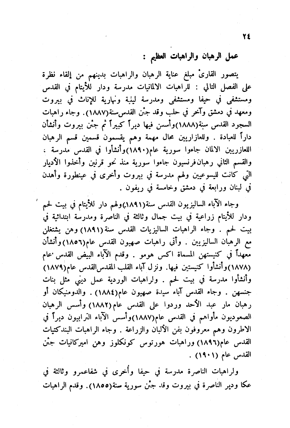 يتصور القارئ مبلغ عناية الرهبان والراهبات بدينهم من إلقاء نظرة على الفصل التالي: للراهبات الألمانيات مدرسة ودار للأيتام في القدس ومستشفى في حيفا ومستشفى ومدرسة ليلية ونهارية للإناث في بيروت ومعهد في دمشق وآخر في حلب وقد جئن القدس سنة 1887. وجاء راهبات السجود القدس سنة 1888 وأسسن فيها ديراً كبيراً ثم جئن بيروت وأنشأن داراً للعبادة. وللعازاريين محال مهمة وهم يقسمون قسمين قسم الرهبان العازريين الألمان جاءوا سورية عام 1890 وأنشئوا في القدس مدرسة، والقسم الثاني رهبان فرنسيون جاءوا سورية منذ نحو قرنين وأخذوا الأديار التي كانت لليسوعيين ولهم مدرسة في بيروت وأخرى في عينطورة وأهدن في لبنان ورابعة في دمشق وخامسة في ريفون.