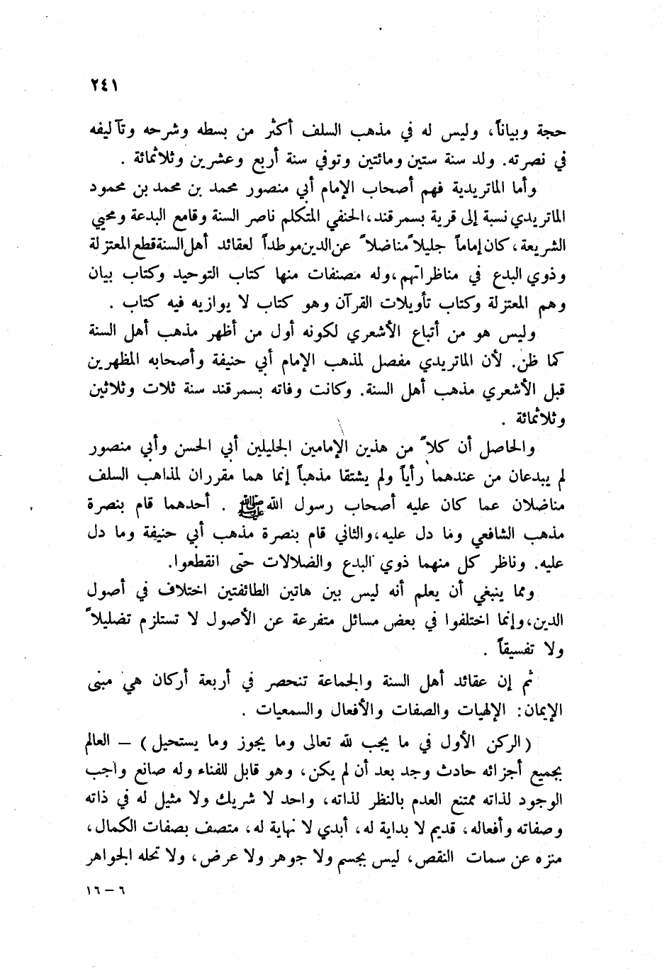 وأما الماتريدية فهم أصحاب الإمام أبي منصور محمد بن محمد بن محمود الماتريدي نسبة إلى قرية بسمرقند، الحنفي المتكلم ناصر السنة وقامع البدعة وحيي الشريعة، كان إماماً جليلاً مناضلاً عن الدين موطداً لعقائد أهل السنة قطع المعتزلة وذوي البدع في مناظرتهم، وله مصنفات منها كتاب التوحيد وكتاب بيان وهم المعتزلة وكتاب تأويلات القرآن وهو كتاب لا يوازيه فيه كتاب.