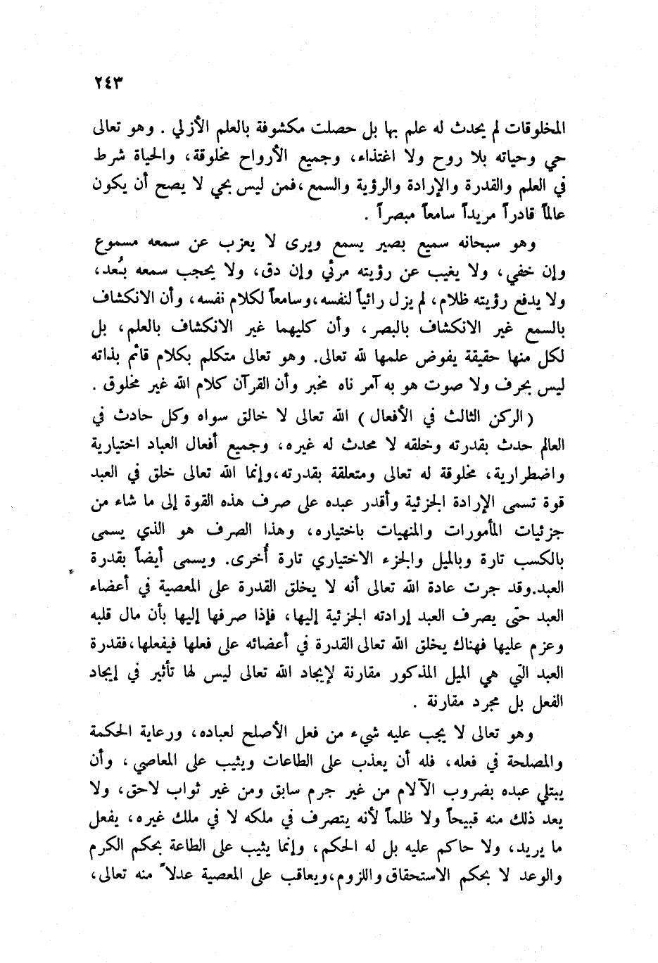الركن الثالث في الأفعال الله تعالى لا خالق سواه وكل حادث في العالم حدث بقدرته وخلقه لا محدث له غيره، وجميع أفعال العبادة اختيارية واضطرارية، مخلوقة له تعالى ومتعلقة بقدرته وإنما الله خلق في العبد قوة تسمى الإرادة الجزئية وأقدر عبده على صرف هذه القوة إلى ما شاء من جزئيات المأمورات والمنهيات
