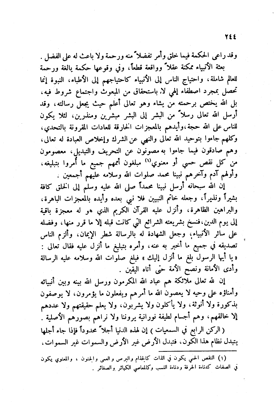 أن الله سبحانه أرسل نبينا محمداً صلى الله عليه وسلم إلى الخلق كافة بشيراً نذيراً، وجعله خاتم النبيين فلا نبي بعده وأيده بالمعجزات الباهرة، والبراهين الظاهرة، وانزل عليه القرآن الكريم الذي هو له معجزات باقية إلى يوم الدين، فنسخ بشريعته الشرائع التي كانت قبله إلا ما قرر منها، وفضله على سائر الأنبياء وجعل الشهادة له بالرسالة شطر الإيمان، وألزم الناس تصديقه في جميع ما اخبر به عنه، وأمر بتبليغ ما انزل عليه فقال تعالى: (يا أيها الرسول بلغ ما أنزل إليك) فبلغ صلوات الله وسلامه عليه الرسالة وأدى الأمانة ونصح الأمة حتى أتاه اليقين.