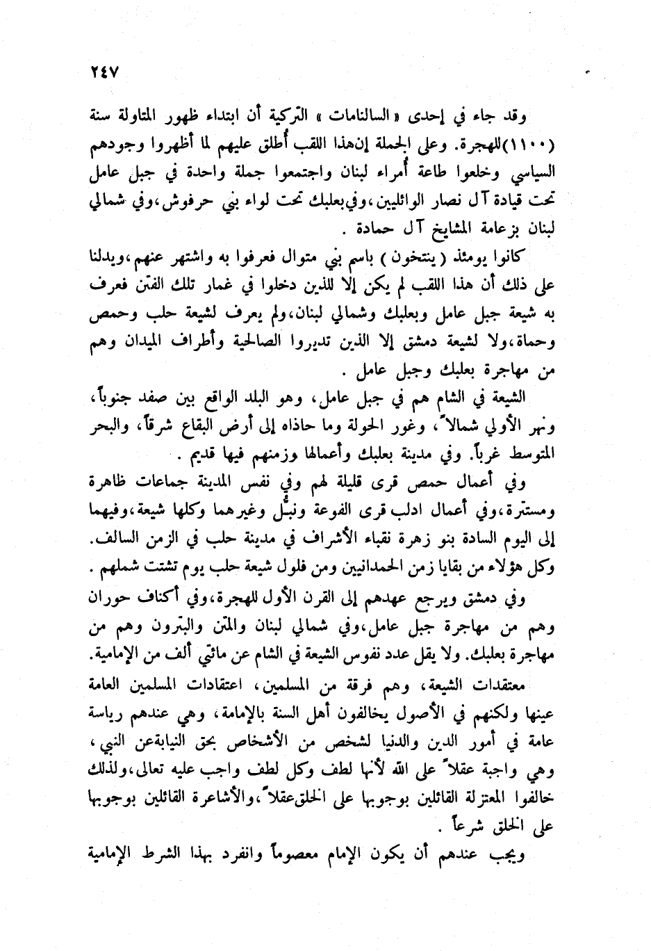 وفي أعمال حمص قرى قليلة لهم وفي نفس المدينة جماعات ظاهرة ومستترة، وفي أعمال إدلب قرى الفوعة ونبل وغيرهما وكلها شيعة، وفيهما إلى اليوم السادة بنو زهرة نقباء الأشراف في مدينة حلب في الزمن السالف. وكل هؤلاء من بقايا زمن الحمدانيين ومن فلول شيعة حلب يوم تشتت شملهم. وفي دمشق ويرجع عهدهم إلى القرن الأول للهجرة، وفي أكناف حوران وهم من مهاجرة جبل عامل، وفي شمالي لبنان والمتن والبترون وهم من مهاجرة بعلبك. ولا يقل عدد نفوس الشيعة في الشام عن مائتي ألف من الإمامية. معتقدات الشيعة، وهم فرقة من المسلمين، اعتقادات المسلمين العامة عينها ولكنهم في الأصوال يخالفون أهل السنة بالإمامة، وهي عندهم رياسة عامة في أمور الدين والدنيا لشخص من الأشخاص بحق النيابة عن النبي، وهي واجبة عقلاً على الله لأنها لطف وكل لطف واجب عليه تعالى، ولذلك خالفوا المعتزلة القائلين بوجوبها على الخلق عقلا، والأشاعرة القائلين على الخلق شرعاً.