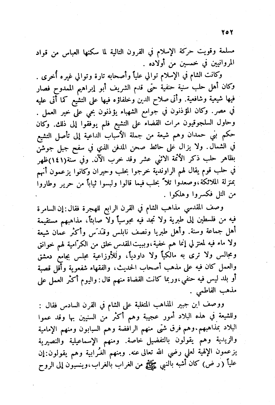 ووصف ابن جبير المذاهب المتغلبة على الشام في القرن السادس فقال: وللشيعة في هذه البلاد أمور عجيبة وهم أكثر من السنيين بها وقد عموا البلاد بمذاهبهم، وهم فرق شتى منهم الرافضة وهم البسبابون ومنهم الإمامية والزيدية وهم يقولون بالتفضيل خاصة. ومنهم الإسماعيلية والنصيرية يزعمون الإلهية لعلي رضي الله تعالى عنه. ومنهم الغُرابية وهم يقولون: إن علياً رض كان أشبه بالنبي صلى الله عليه وسلم من الغراب بالغراب، وينسبون إلى الروح