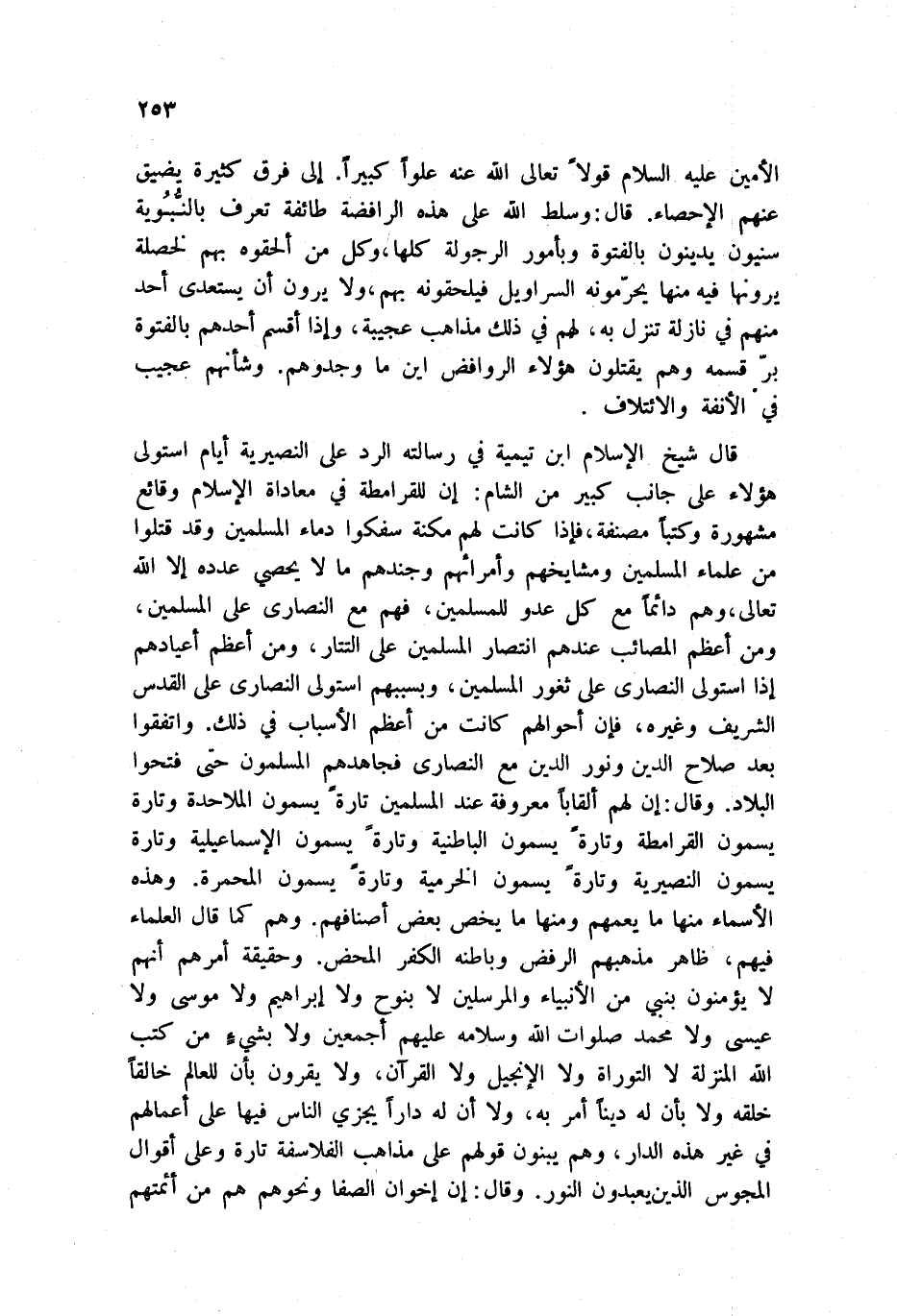 ومشايخهم وأمرائهم وجندهم ما لا يحصي عدده إلا الله تعالى، وهم دائماً مع كل عدو للمسلمين، فهم مع النصارى على المسلمين، ومن أعظم المصائب عندهم انتصار المسلمين على التتار، ومن أعظم أعيادهم إذا استولى النصارى على ثغور المسلمين، وبسببهم استولى النصارى على القدس الشريف وغيره، فإن أحوالهم كانت أعظم الأسباب في ذلك. واتفقوا بعد صلاح الدين ونور الدين مع النصارى فجاهدهم المسلمون حتى فتحوا البلاد. وقال: إن لهم ألقاباً معروفة عند المسلمين تارةً يسمون الملاحدة وتارة يسمون القرامطة وتارةً يسمون الباطنية وتارةً يسمون الإسماعيلية وتارةً يسمون النصيرية وتارةً يسمون الخرمية وتارةً يسمون المحمرة. وهذه الأسماء منها ما يعمهم ومنها ما يخص بعض أصنافهم. وهم كما قال العلماء فيهم، ظاهر مذهبهم الرفض وباطنه الكفر المحض. وحقيقة أمرهم أنهم لا يؤمنون بنبي من الأنبياء والمرسلين لا بنوح ولا إبراهيم ولا موسى ولا عيسى ولا محمد صلوات الله وسلامه عليهم أجمعين ولا بشيء من كتب الله المنزلة لا التوراة ولا الإنجيل ولا القرآن، ولا يقرون بأن للعالم خالقاً خلقه ولا بأن له ديناً أمر به، ولا أن له داراً يجزي الناس فيها على أعمالهم في غير هذه الدار، وهم يبنون قولهم على مذاهب الفلاسفة تارة وعلى أقوال المجوس الذين يعبدون النور. وقال: إن إخوان الصفا ونحوهم هم من أئمتهم