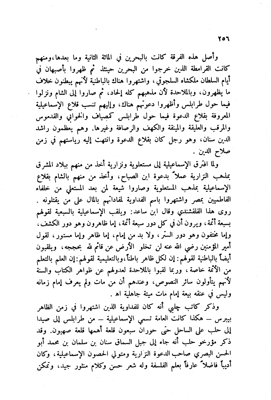 وأصل هذه الفرقة كانت بالبحرين في المائة الثانية وما بعدها، ومنهم كانت القرامطة الذين خرجوا من البحرين حينئذ ثم ظهروا بأصبهان في أيام السلطان ملكشاه السلجوقي، واشتهروا هنالك بالباطنية لأنهم يبطنون خلاف ما يظهرون، وبالملاحدة لأن مذهبهم كله إلحاد، ثم صاروا إلى الشام ونزلوا فيما حول طرابلس وأظهروا دعوتهم هناك، وإليهم تنسب قلاع الإسماعيلية المعروفة بقلاع الدعوة فيما حول طرابلس كمصياف والخوابي والقدموس والمرقب والعقليقة والكهف والرصافة وغيرها. وهم يعظمون راشد الدين سنان، وهو رجل كان بقلاع الدعوة وانتهت إليه رياستهم في زمن صلاح الدين.