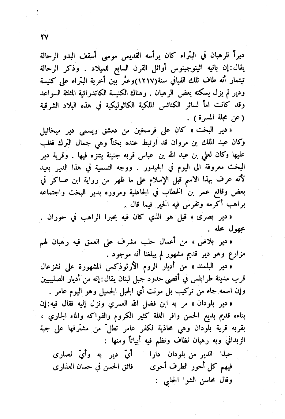 دير بلودان مر به ابن فضل الله العمري ونزل إليه فقال فيه: إن بناءه قديم بديع الحسن وافر الغلة كثير الكروم والفواكه والماء الجاري، بقربه قرية بلودان وهي محاذية لكفر عامر تطل من مشترفها على جبة الزبداني وبه رهبان نظاف ونظم فيه أبياتاً ومنها: