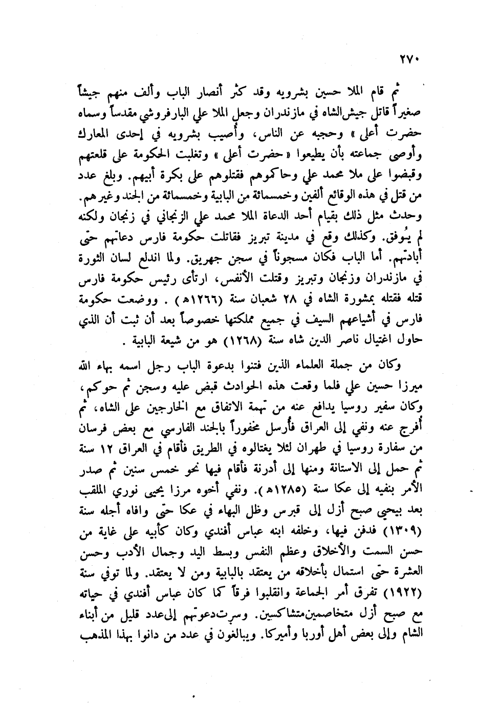 أعلى وحجبه عن الناس، وأصيب بشرويه في إحدى المعارك وأوصى جماعته بأن يطيعوا حضرت أعلى وتغلبت الحكومة على قلعتهم وقبضوا على ملا محمد وحاكموهم فقتلوهم على بكرة أبيهم. وبلغ عدد من قتل في هذه الوقائع ألفين وخمسمائة من البابية وخمسمائة من الجند وغيرهم. وحدث مثل ذلك بقيام أحد الدعاة الملا محمد علي الزنجاني في زنجان ولكنه لم يوفق. وكذلك وقع في مدينة تبريز فقاتلت حكومة فارس دعاتهم حتى أبادتهم. أما الباب فكان مسجوناً في سجن جهريق. ولما اندلع لسان الثورة في مازندران وزنجان وتبريز وقتلت الأنفس، ارتأى رئيس حكومة فارس قتله فقتله بمشورة الشاه في 28 شعبان سنة 1266هـ. ووضعت حكومة فارس في أشياعهم السيف في جميع مملكتها خصوصاً بعد أن ثبت أن الذي حاول اغتيال ناصر الدين شاه سنة 1268 هو من شيعة البابية.