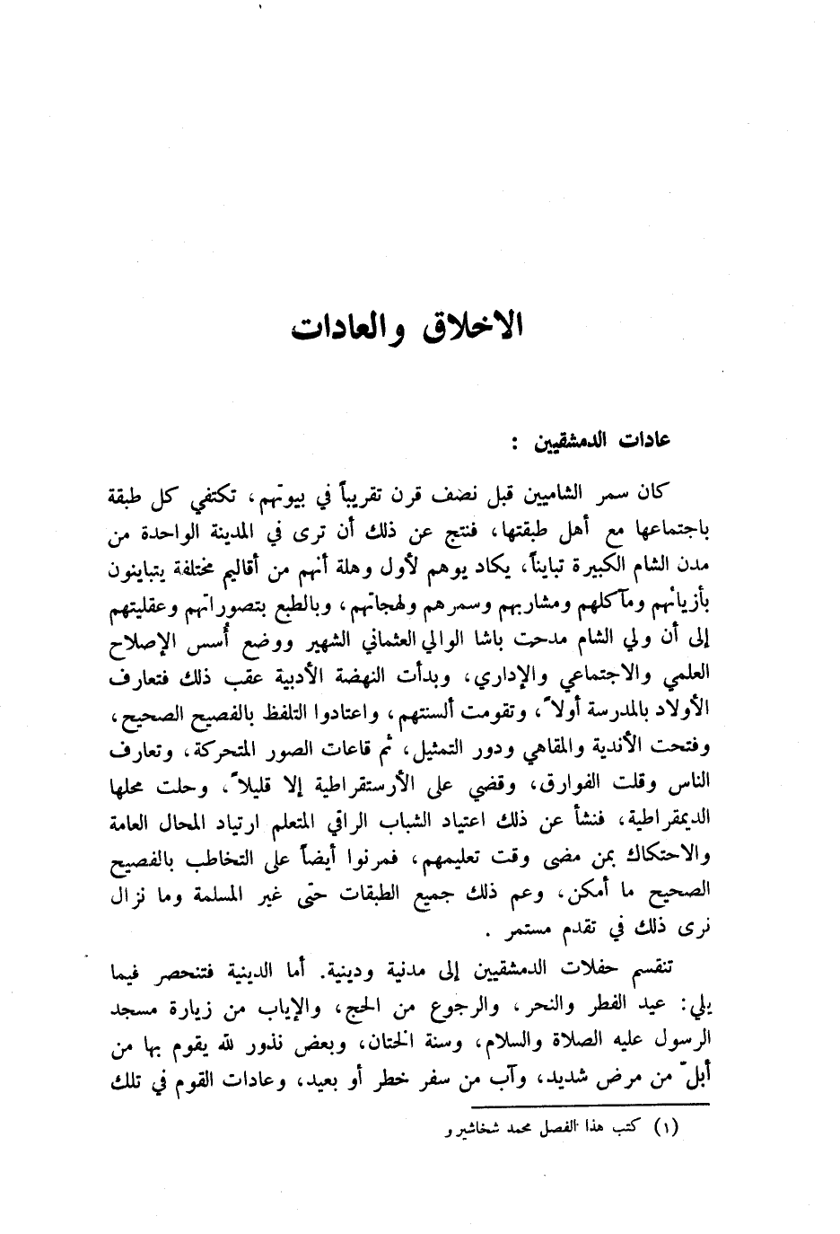 كان سمر الشاميين قبل نصف قرن تقريباً في بيوتهم، نكتفي كل طبقة باجتماعها مع أهل طبقتها، فنتج عن ذلك أن في المدينة الواحدة من مدن الشام المبيرة تبايناً وسمرهم ولهجاتهم، وبالطبع بتصوراتهم وعقليتهم إلى أن ولي الشام مدحت باشا الوالي العثماني الشهير ووضع أسس الإصلاح العلمي والاجتماعي والإداري، وبدأت النهضة الأدبية عقب ذلك فتعارف الأولاد بالمدرسة أولاً، وتقومت ألسنتهم، واعتادوا التلفظ بالفصيح الصحيح، وفتحت الأندية والمقاهي ودور التمثيل، ثم قاعات الصور المتحركة، وتعارف الناس وقلت الفوارق، وقضى على الأرستقراطية إلا قليلاً، وحلت محلها الديمقراطية، فنشأ عن ذلك اعتياد الشباب الراقي المتعلم ارتياد المحال العامة والاحتكاك بمن مضى وقت تعليمهم، فمرنوا أيضاً على التخاطب بالفصيح الصحيح ما أمكن، وعم ذلك جميع الطبقات حتى غير المسلمة وما نزال نوى ذلك في تقدم مستمر. تنقسم حفلات الدمشقيين إلى مدنية ودينية. أما الدينية فتنحصر فيما يلي: عيد الفطر والنحر، والرجوع من الحج، والإياب من زيارة مسجد الرسول عليه الصلاة السلام، وسنة الختان، وبعض نذور لله يقوم بها من أبل من مرض شديد، وآب من سفر خطر أو بعيد، وعادات القوم في تلك