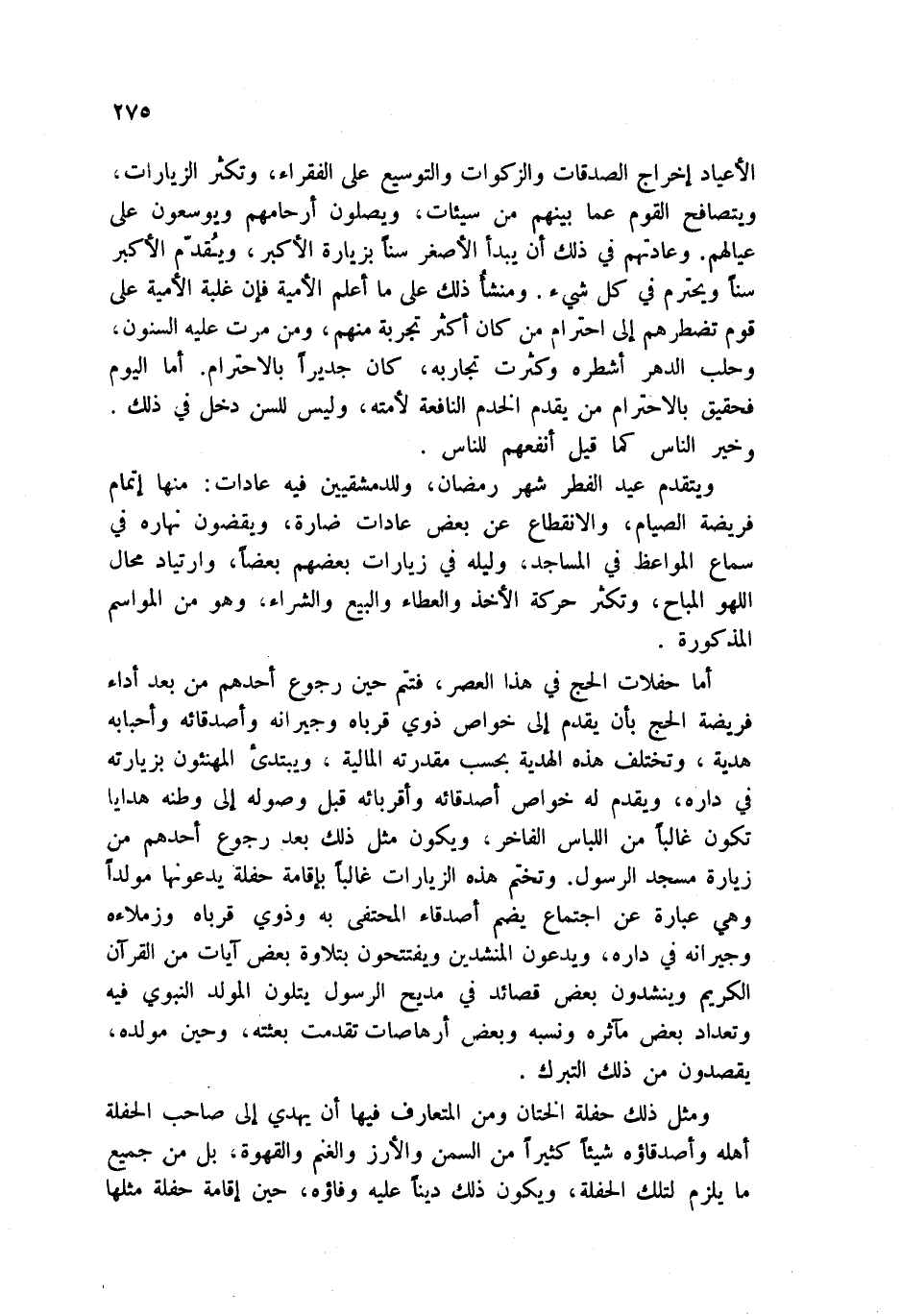 الأعياد إخراج الصدقات والزكوات والتوسيع على الفقراء، وتكثر الزيارات ويتصافح القوم عما بينهم من سيئات، ويصلون أرحامهم ويوسعون على عيالهم. وعادتهم في ذلك أن يبدأ الأصغر سناً بزيارة الأكبر، ويقدم الأكبر سناً ويحترم في كل شيء. ومنشأ ذلك على ما أعلم الأمية فإن غلبة الأمية على قوم تضطرهم إلى احترام من كان أكثر تجربة منهم، ومن مرت عليه السنون، وحلب الدهر أشطره وكثرت تجاربه، كان جديراً بالاحترام. أما اليوم