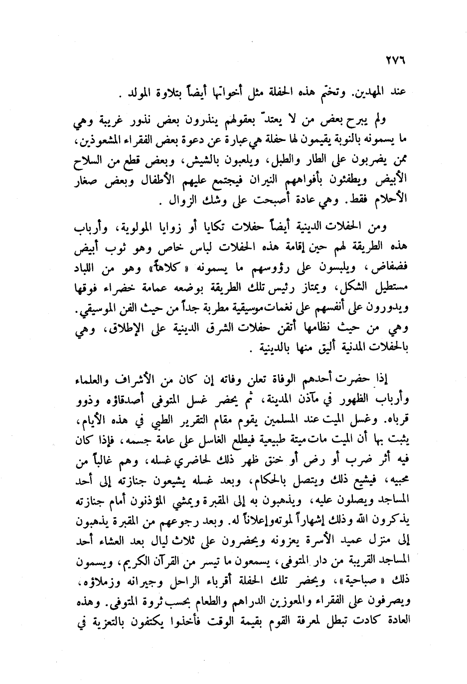 إذا حضرت أحدهم الوفاة تعلن وفاته إن كان من الأشراف والعلماء وأرباب الظهور في مآذن المدينة، ثم يحضر غسل المتوفى أصدقاؤه وذوو قرباه. وغسل الميت عند المسلمين يقوم مقام التقرير الطبي في هذه الأيام، يثبت بها أن الميت مات ميتة طبيعية فيطلع الغاسل على عامة جسمه، فإذا كان فيه أثر ضرب أو رض أو خنق ظهر ذلك لحاضري غسله، وهم غالباً من محبيه، فيشيع ذلك ويتصل بالحكام، وبعد غسله يشيعون جنازته إلى أحد المساجد ويصلون عليه، ويذهبون به إلى المقبرة ويمشي المؤذنون أما جنازته يذكرون الله وذلك إشهاراً لموته وإعلاناً له. وبعد رجوعهم من المقبرة يذهبون إلى منزل عميد الأسرة يعزونه ويحضرون على ثلاث ليال بعد العشاء أحد المساجد القريبة من دار المتوفى، يسمعون ما تيسر من القرآن الكريم، ويسمون ذلك صباحية، ويحضر تلك الحفلة أقرباء الراحل وجيرانه وزملاؤه ويصرفون على الفقراء والمعوزين الدراهم والطعام بحسب ثروة المتوفى. وهذه العادة كادت تبطل لمعرفة القوم بقيمة الوقت فأخذوا يكتفون بالتعزية في