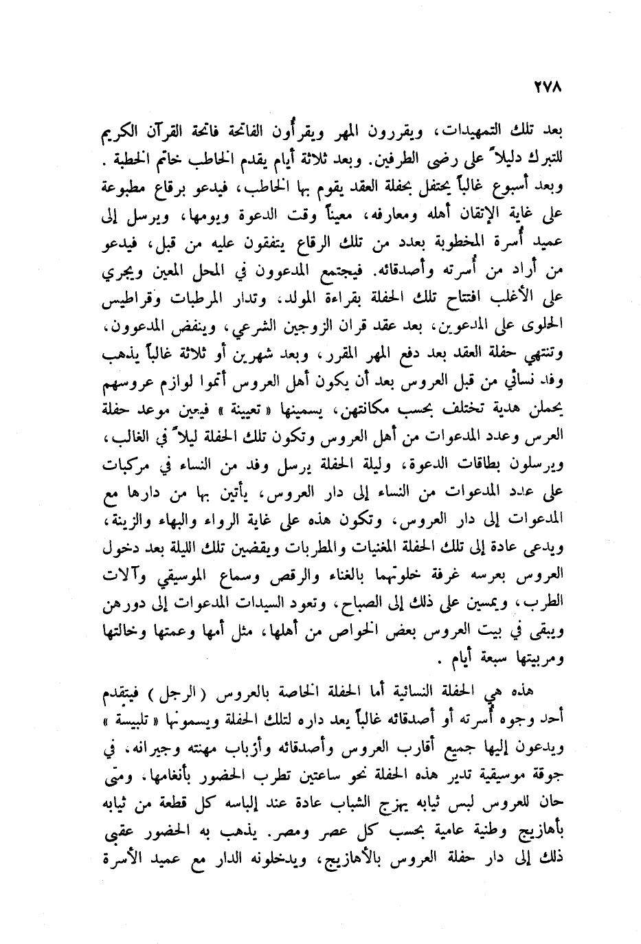 بعد تلك التمهيدات، ويقررون المهر ويقرءون فاتحة القرآن الكريم للتبرك دليلاً على رضى الطرفين. وبعد ثلاثة أيام يقدم الخاطب خاتم الخطبة. وبعد أسبوع غالباً يحتفل بحفلة العقد يقوم بها الخاطب، ويدعوا برقاع مطبوعة على غاية الإتقان أهله ومعارفه، معيناً وقت الدعوة ويومها، يرسل إلى عميد أسرة المخطوبة بعدد من تلك الرقاع ينفقون عليه من قبل، فيدعو من أراد من أسرته وأصدقائه. فيجتمع المدعوون في المحل المعين ويجري على الأغلب افتتاح تلك الحفلة بقراءة المولد، وتدار المرطبات وقراطيس الحلوى على المدعوين، بعد عقد قران الزوجين الشرعي، وينفض المدعوون، وتنتهي حفلة العقد بعد دفع المهر المقرر، وبعد شهرين أو ثلاثة غالباً يذهب وفد نسائي من قبل العروس بعد أن يكون أهل العروس أتموا لوازم عروسهم يحملن هدية تختلف بحسب مكانتهن، يسمينها تعيينة فيعين موعد حفلة العرس وعدد المدعوات من أهل العروس وتكون تلك الحفلة ليلاً في الغالب، ويرسلون بطاقات الدعوة، وليلة الحفلة يرسل وفد من النساء في مركبات على عدد المدعوات من النساء إلى دار العروس، يأتين بها من دارها مع المدعوات إلى دار العروس، وتكون هذه غاية الرواء والبهاء والزينة، ويدعى عادة إلى تلك الحفلة المغنيات والمطربات ويقضين تلك الليلة بعد دخول العروس بعرسه غرفة خلوتهما بالغناء والرقص وسماع الموسيقى وآلات الطرب، ويمسين على ذلك إلى الصباح، وتعود السيدات المدعوات إلى دورهن ويبقى في بيت العروس بعض الخواص من أهلها، مثل أمها وعمتها وخالتها ومربيتها سبعة أيام.