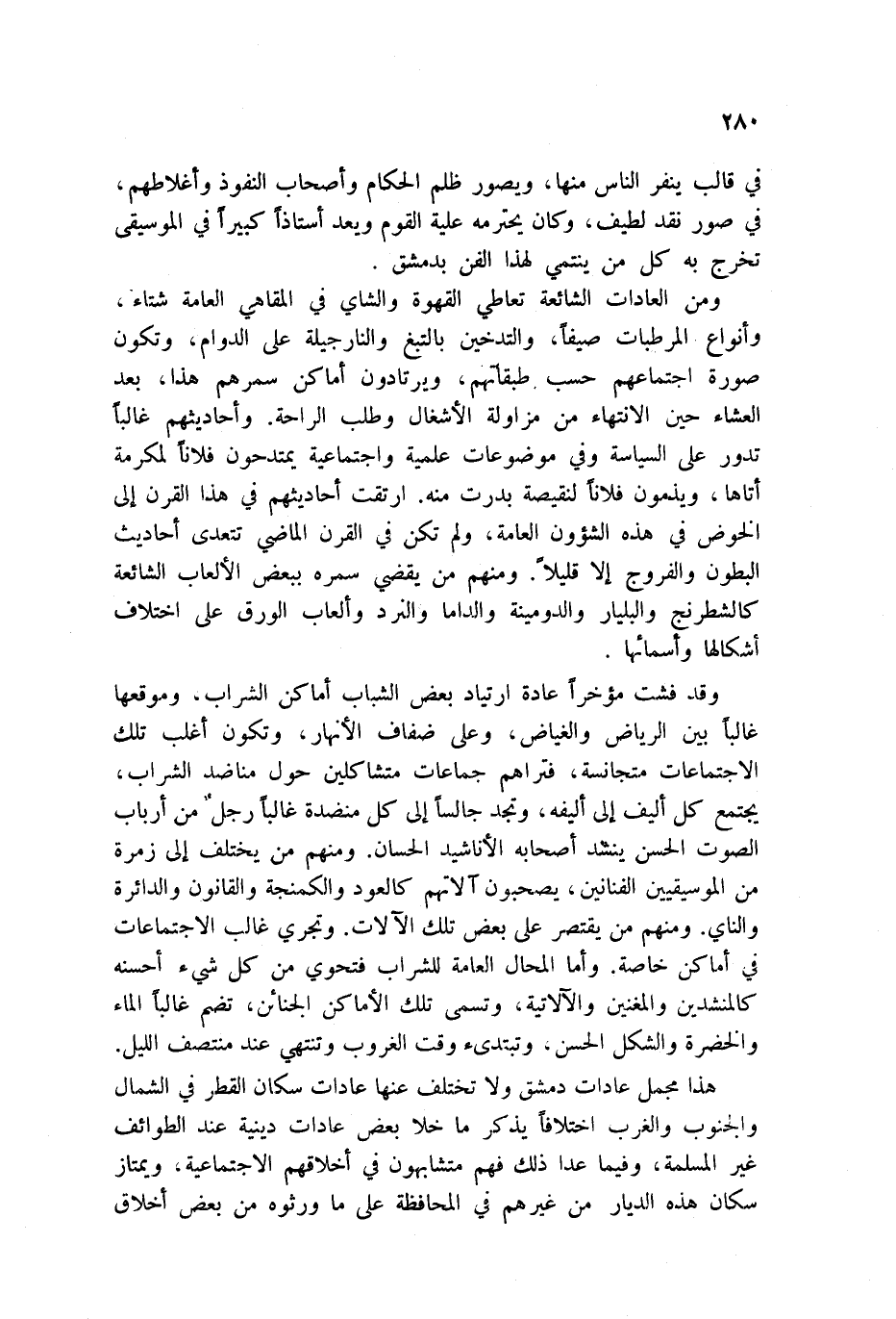 وهذا مجمل عادات دمشق ولا تختلف عنها عادات سكان القطر في الشمال والجنوب والغرب اختلافاً يذكر ما خلا بعض عادات دينية عند الطوائف غير المسلمة، وفيما عدا ذلك فهم متشابهون في أخلاقهم الاجتماعية، ويمتاز سكان هذا الديار من غيرهم في المحافظة على ما ورثوه من بعض أخلاق