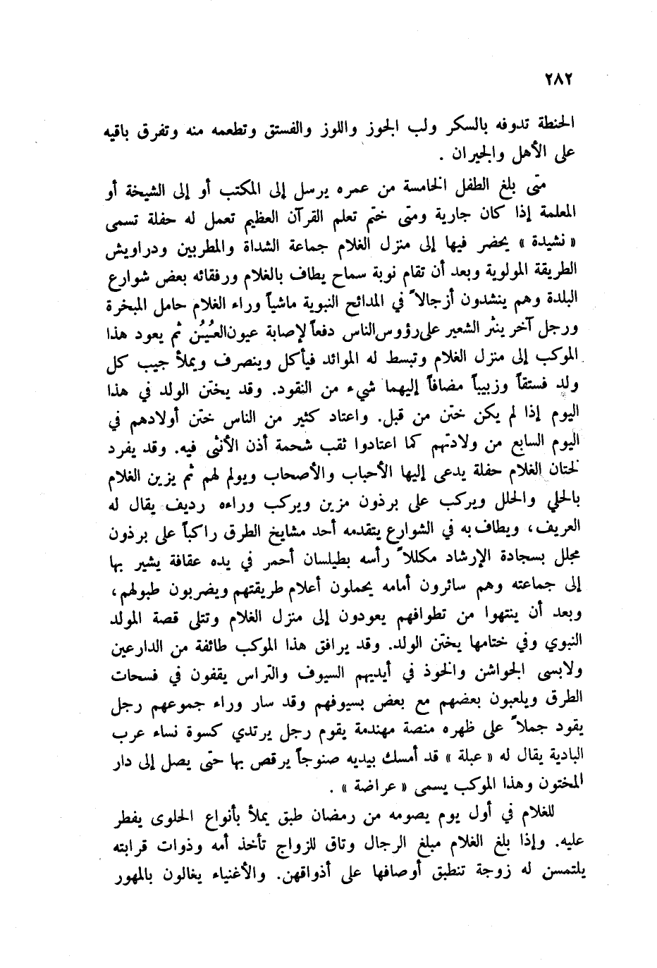 وتبسط له الموائد فيأكل وينصرف ويملأ جيب كل ولد فستقاً وزبيباً مضافاً إليهما شيء من النقود. وقد يختن الولد في هذا اليوم إذا لم يكن ختن من قبل. واعتاد كثير من الناس ختن أولادهم في اليوم السابع من ولادتهم كما اعتادوا ثقب شحمة أذن الأنثى فيه. وقد يفرد لختان الغلام حفلة يدعى إليها الأحباب والأصحاب ويولم لهم ثم يزين الغلام بالحلي والحلل ويركب على برذون مزين ويركب وراءه رديف يقال له العريف، ويطاف به في الشوارع يتقدمه أحد مشايخ الطرق راكباً على برذون مجلل بسجادة الإرشاد مكللا رأسه بطيلسان أحمر في يده عقافة يشير بها إلى جماعته وهم سائرون أمامه يحملون أعلام طريقتهم ويضربون طبولهم، وبعد أن ينتهوا من طوافهم يعودون إلى منزل الغلام وتتلى قصة المولد النبوي ختامها يختن الولد. وقد يرافق هذا الموكب طائفة من الدارعين ولابسي الجواشن والخوذ في أيديهم السيوف والتراس يقفون في فسحات الطرق ويلعبون بعضهم مع بعض بسيوفهم وقد سار وراء جموعهم رجل يقود جملاً على ظهره منصة مهندمة يقوم رجل يرتدي كسوة نساء عرب البادية يقال له عبلة قد أمسك بيديه صنوجاً يرقص بها حتى يصل إلى دار المختون وهذا الموكب يسمى عراضة.