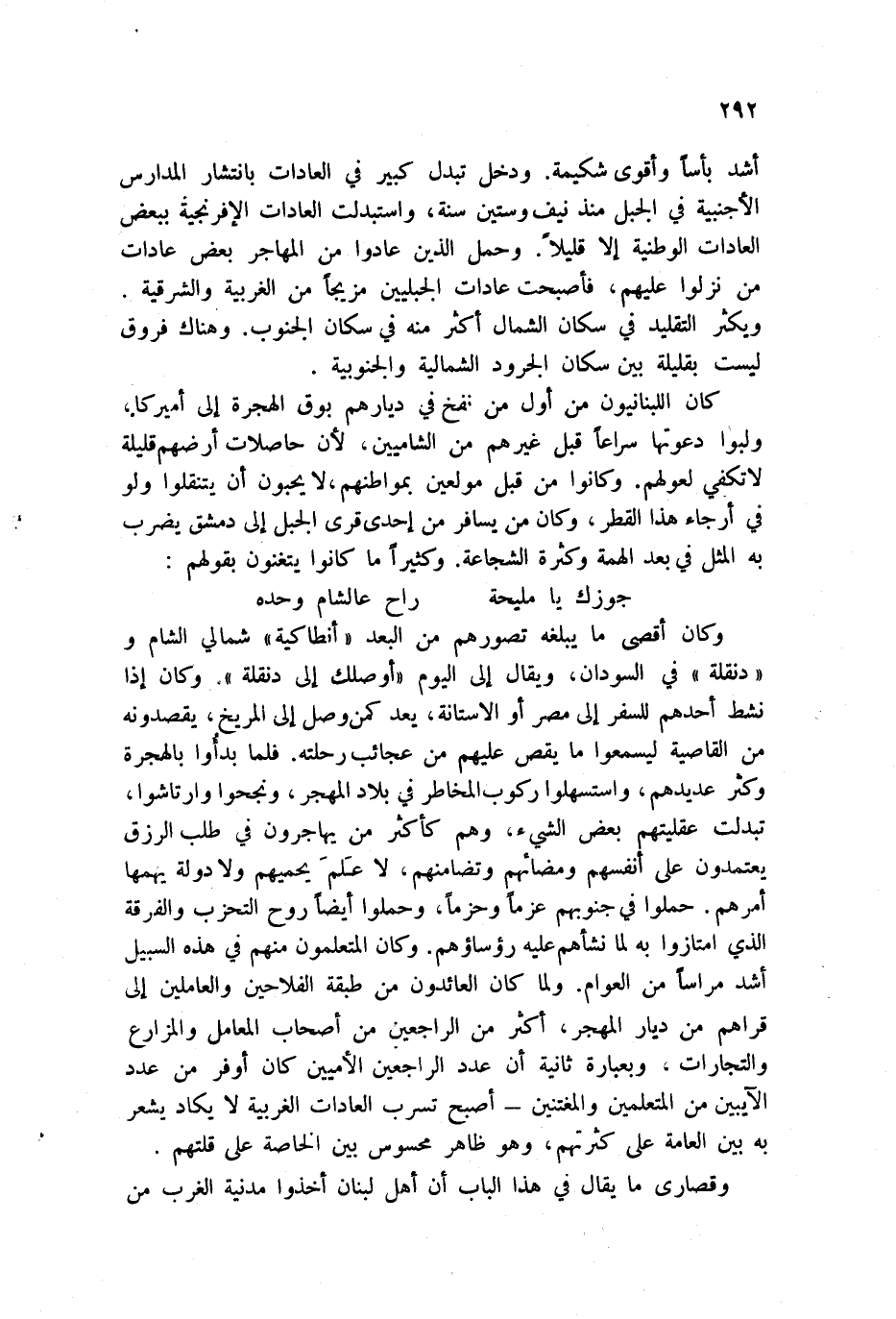 المخاطر في بلاد المهجر، ونجحوا وارتاشوا، تبدلت عقليتهم بعض الشيء، وهم كأكثر من يهاجرون في طلب الرزق يعتمدون على أنفسهم ومضائهم وتضامنهم، لا علم يحميهم ولا دولة يهمها أمرهم. حملوا في جنوبهم عزماً وحزماً، وحملوا أيضاً روح التحزب والفرقة الذي امتازوا به لما نشأهم عليه رؤساؤهم. وكان المتعلمون منهم في هذه السبيل أشد مراساً من العوام. ولما كان العائدون من طبقة الفلاحين والعاملين إلى قرارهم من ديار المهجر، أكثر من الراجعين من أصحاب المعامل والمزارع والتجارات، وبعبارة ثانية أن عدد الفلاحين الأميين كان أوفر من عدد الآيبين من المتعلمين والمغتنين أصبح تسرب العادات الغربية لا يكاد يشعر به بين العامة على كثرتهم، وهو ظاهر محسوس بين الخاصة على قلتهم.