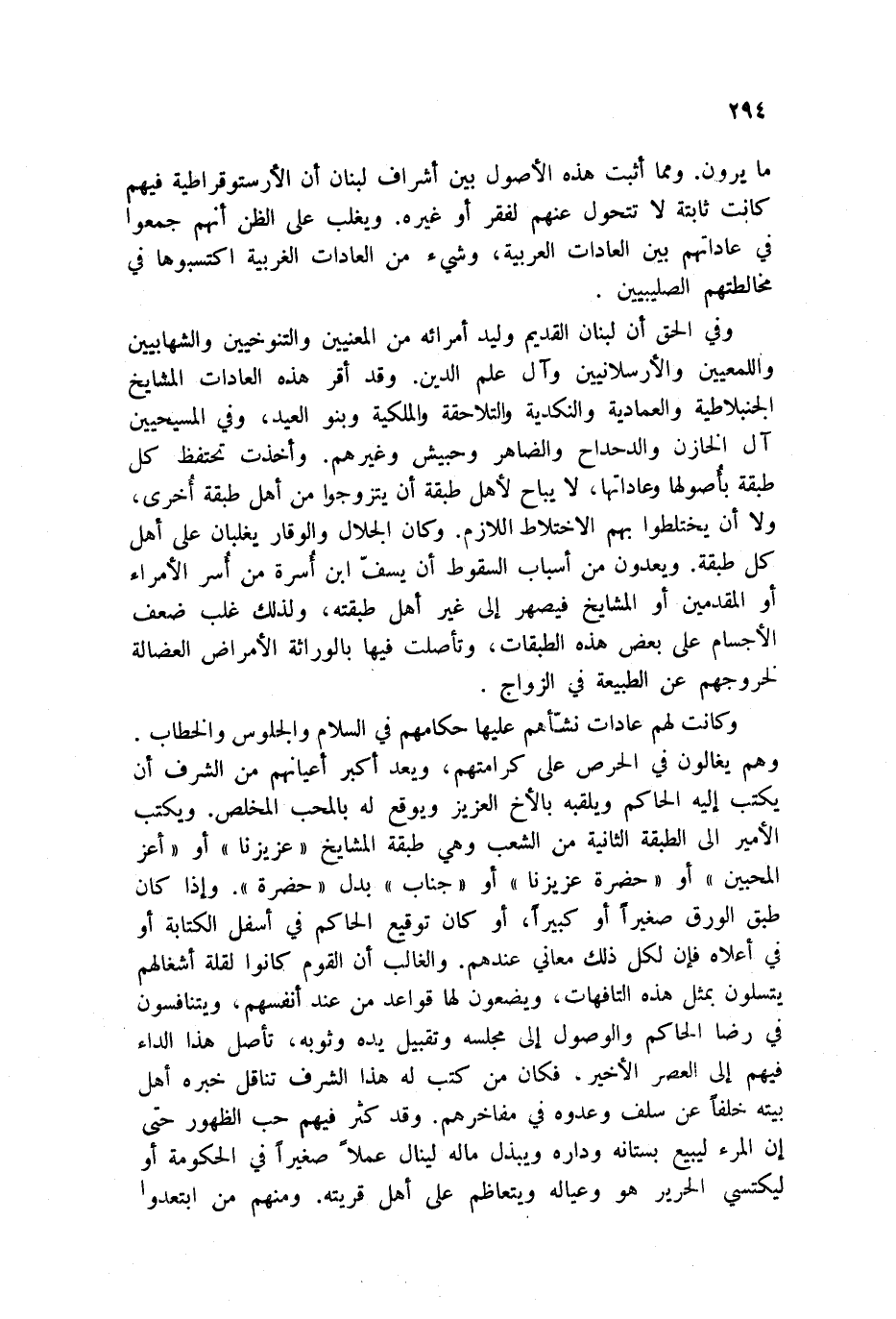 ما يرون. ومما أثبت هذه الأصول بين الأشراف لبنان أن الأرستقراطية فيهم كانت ثابتة لا تتحول عنهم لفقر أو غيره. ويغلب على الظن أنهم جمعوا في عاداتهم بين العادات العربية، وشيء من العادات الغربية اكتسبوها في مخالطتهم الصليبيين.