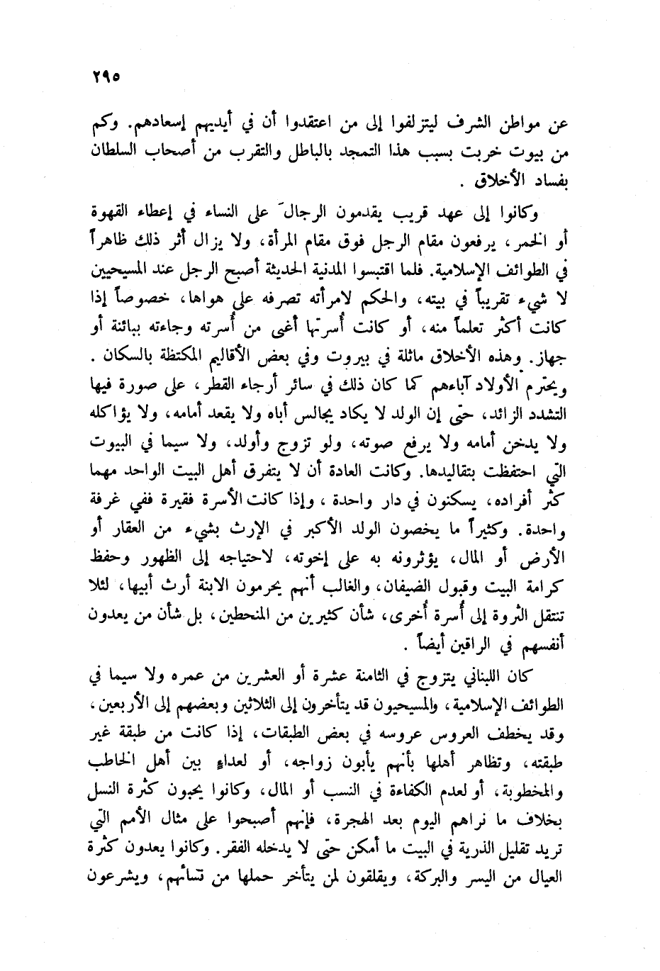 وكانوا إلى عهد قريب يقدمون الرجال على النساء في إعطاء القهوة أو الخمر، يرفعون مقام الرجل فوق مقام المرأة، ولا يزال أثر ذلك ظاهراً في الطوائف الإسلامية. فلما اقتبسوا المدينة الحديثة أصبح الرجل عند المسيحيين لا شيء تقريباً في بيته، والحكم لامرأته تصرفه على هواها، خصوصاً إذا كانت تعلماً منه، أو