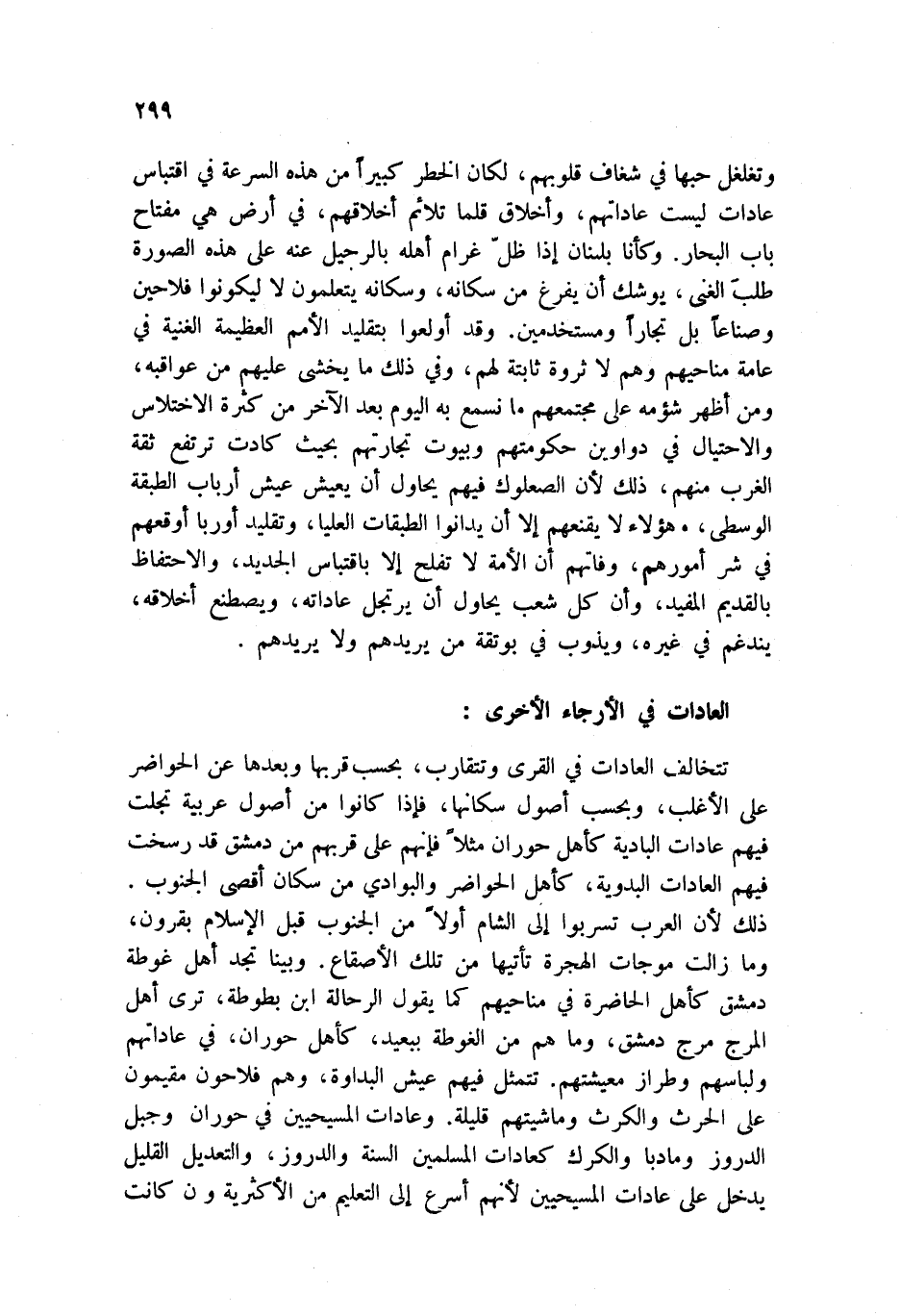 موجات الهجرة تأتيها من تلك الأصقاع. وبينا تجد أهل غوطة دمشق كأهل الحضرة في مناحيهم كما يقول الرحالة ابن بطوطة، ترى أهل مرج دمشق، وما هم من الغوطة ببعيد، كأهل حوران، في عاداتهم ولباسهم وطراز معيشتهم. تتمثل فيهم عيش البداوة، وهم فلاحون مقيمون على الحرث والكرث وماشيتهم قليلة. وعادات المسيحيين في حوران وجبل الدروز ومادبا والكرك كعادات المسلمين السنة والدروز، والتعديل القليل على عادات المسيحيين لأنهم أسرع إلى التعليم من الأكثرية وإن كانت