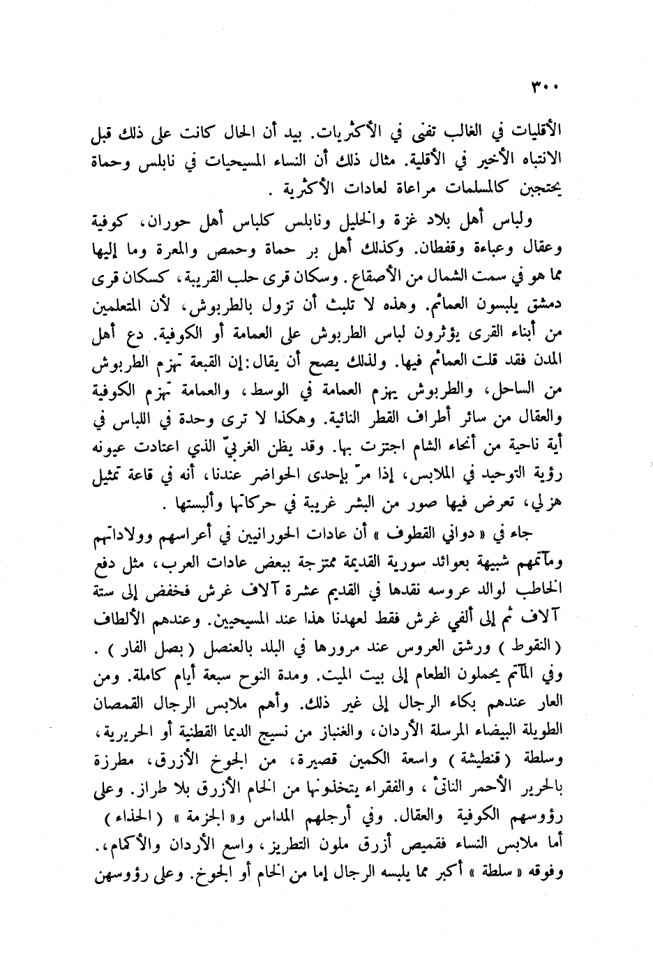 ولباس أهل بلاد غزة والخليل ونابلس كلباس أهل حوران، كوفية وعقال وعباءة وقفطان. وكذلك أهل بر حماة وحمص والمعرة وما إليها مما هو في سمت الشمال من الأصقاع. وسكات قرى حلب القريبة، كسكان قرى دمشق يلبسون العمائم. وهذه لا تلبس أن تزول بالطربوش، لأن المتعلمين من أبناء القرى يؤثرون لباس الطربوش على العمامة أو الكوفية. دع أهل المدن فقد قلت العمائم فيها. ولذلك يصح أن يقال: إن القبعة تهزم الطربوش من الساحل، والطربوش يهزم العمامة في الوسط، والعمامة تهزم الكوفية والعقال من سائر أطراف القطر النائية. وهكذا لا ترى وحدة في اللباس في أي ناحية من أنحاء الشام اجتزت بها. وقد يظن الغربي الذي اعتادت عيونه رؤية التوحيد في الملابس، إذا مر بإحدى الحواضر عندنا، أنه في قاعة تمثيل هزلي، تعرض فيها صور من البشر غربية في حركاتها وألبستها.