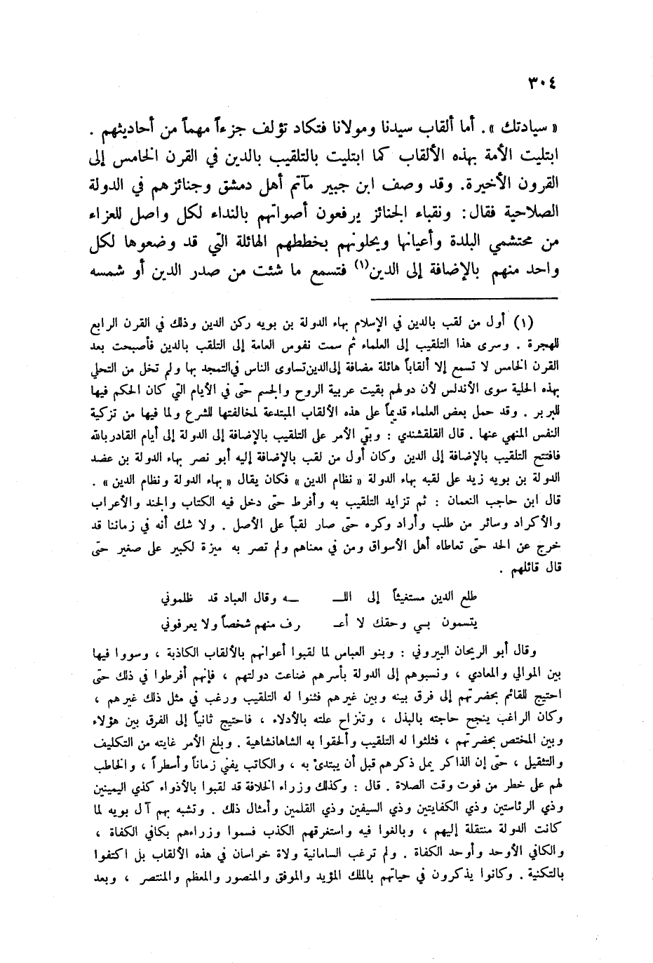 أحاديثهم ابتليت الأمة بهذه الألقاب كما ابتليت بالتلقيب بالدين في القرن الخامس إلى القرون الأخيرة. وقد وصف ابن جبير مآتم أهل دمشق وجنائزهم في الدولة الصلاحية فقال: ونقباء الجنائز يرفعون أصواتهم بالنداء لكل واصل للعزاء من محتشمي البلدة وأعيانها ويحلونهم بخططهم الهائلة التي قد وضعوها لكل واحد منهم بالإضافة إلى الدين فتسمع ما شئت من صدر الدين أو شمسه