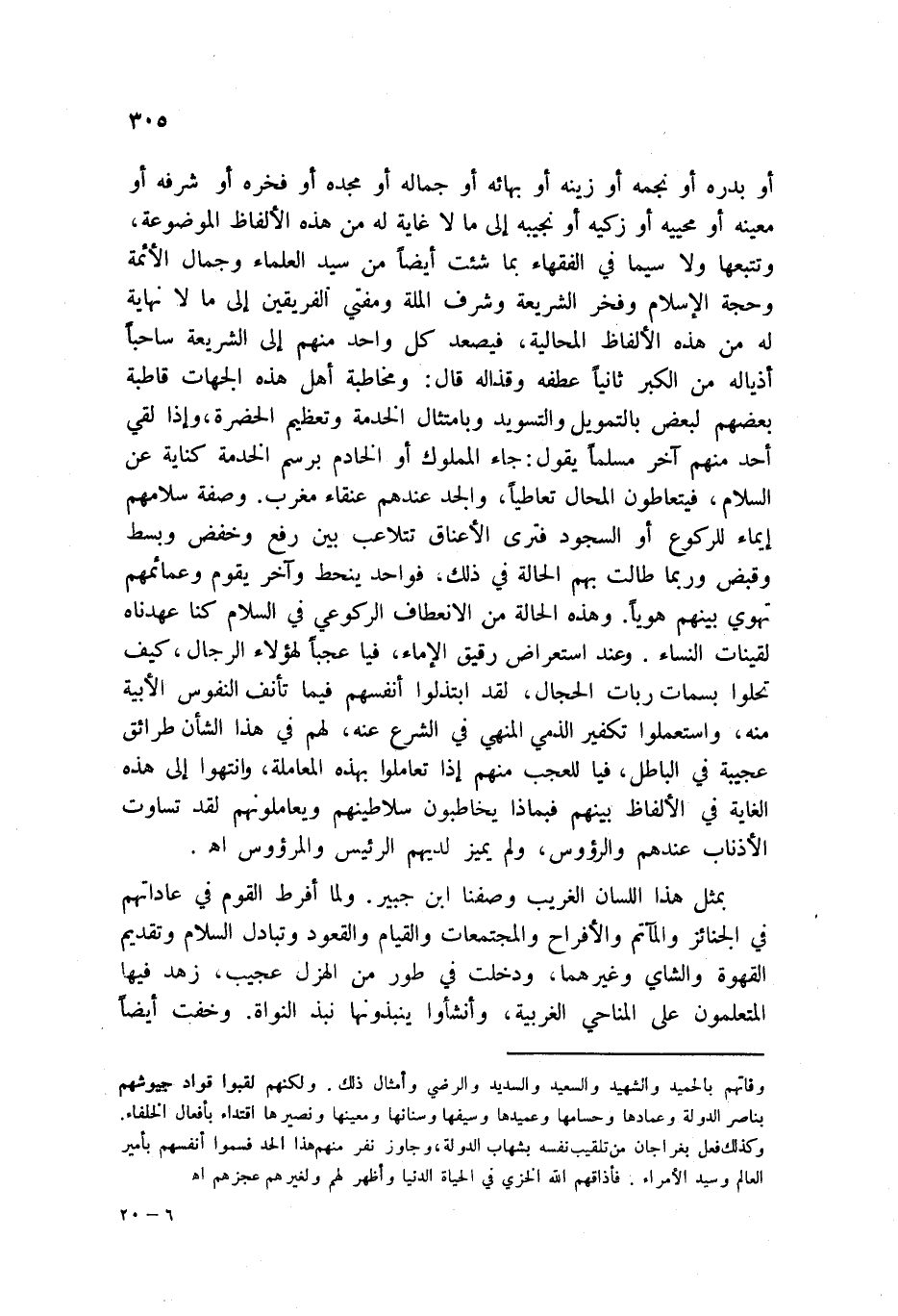 أو بدره أو نجمه أو زينة أو بهائه أو جماله أو مجده أو فخره أو شرفه أو معينه أو محييه أو زكيه أو نجيبه إلى ما لا غاية له من هذه الألفاظ الموضوعة، وتتبعها ولا سيما في الفقهاء بما شئت أيضاً من سيد العلماء وجمال الأئمة وحجة الإسلام وفخر الشريعة وشرف الملة ومفتي الفريقين إلى ما لا نهاية له من هذه الألفاظ المحالية، فيصعد كل واحد منهم إلى الشريعة ساحباً أذياله من الكبر ثانياً عطفه وقذاله قال: ومخاطبة هذه الجهات قاطبة بعضهم لبعض بالتمويل والتسويد وبامتثال الخدمة وتعظيم الحضرة، وإذا لقي أحد منهم آخر مسلماً يقول: جاء المملوك أو الخادم برسم الخدمة كناية عن السلام، فيتعاطون المحال تعاطياً، والجد عندهم عنقاء مغرب. وصفه سلامهم إيماء للركوع أو السجود فترى الأعناق تتلاعب بين رفع وخفض وبسط وقبض وربما طالت بهم الحالة في ذلك، فواحد ينحط وآخر يقوم وعمائمهم تهوي بينهم هوياً. وهذه الحالة من الانعطاف الركوعي في السلام كنا عهدنا لقينات النساء. وعند استعراض رقيق الإماء، فيا عجباً لهؤلاء الرجال، كيف تحلوا بسمات ربات الحجال، لقد ابتذلوا أنفسهم فيما تأنف النفوس الأبية منه، واستعملوا تكفير الذمي المنهي في الشرع عنه، لهم في هذا الشأن طرائق عجيبة في الباطل، فيا للعجب منهم إذا تعاملوا بهذه المعاملة، وانتهوا إلى هذه الغاية في الألفاظ بينهم فبماذا يخاطبون سلاطينهم ويعاملونهم لقد تساوت الأذناب عندهم والرؤوس، ولم يميز لديهم الرئيس والمرؤوس اه.