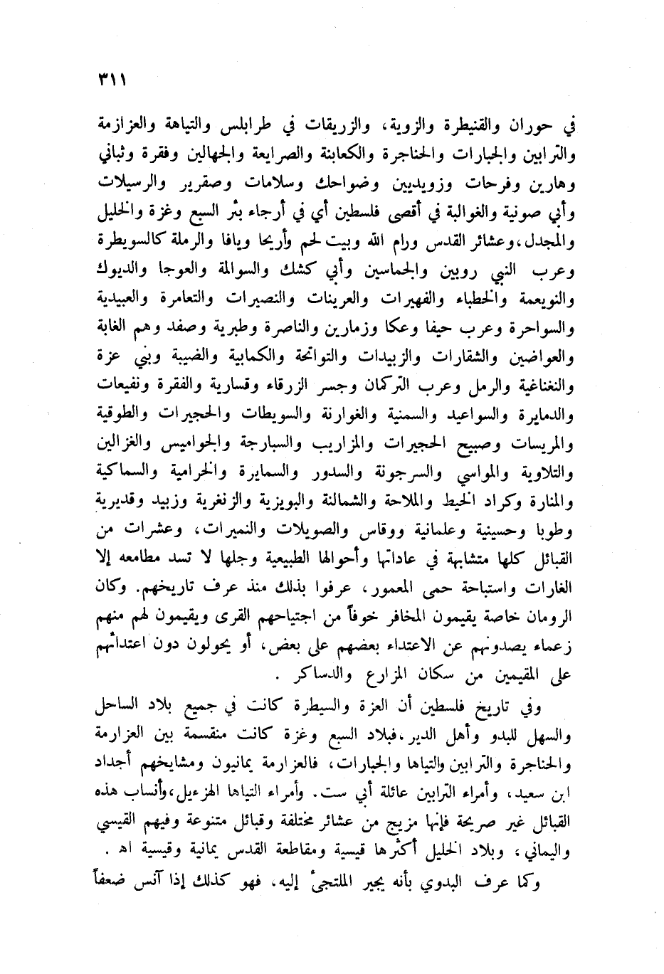 وفي تاريخ فلسطين أن العزة والسيطرة كانت في جميع بلاد الساحل والسهل البدو وأهل الدير، فبلاد السبع وغزة كانت منقسمة بين الغزارمة والحناجرة والترابين والجبارات، فالعزارمة يمانيون ومشايخهم أجداد ابن سعيد، وأمراء الترابين عائلة أبي ست، وأمراء التياها الهزءيل، وأنساب هذه القبائل غير صريحة فإنها مزيج من عشائر مختلفة وقبائل متنوعة وفيهم القيسي واليماني، وبلاد الخليل أكثرها قيسية ومقاطعة القدس يمانية وقيسية اه.